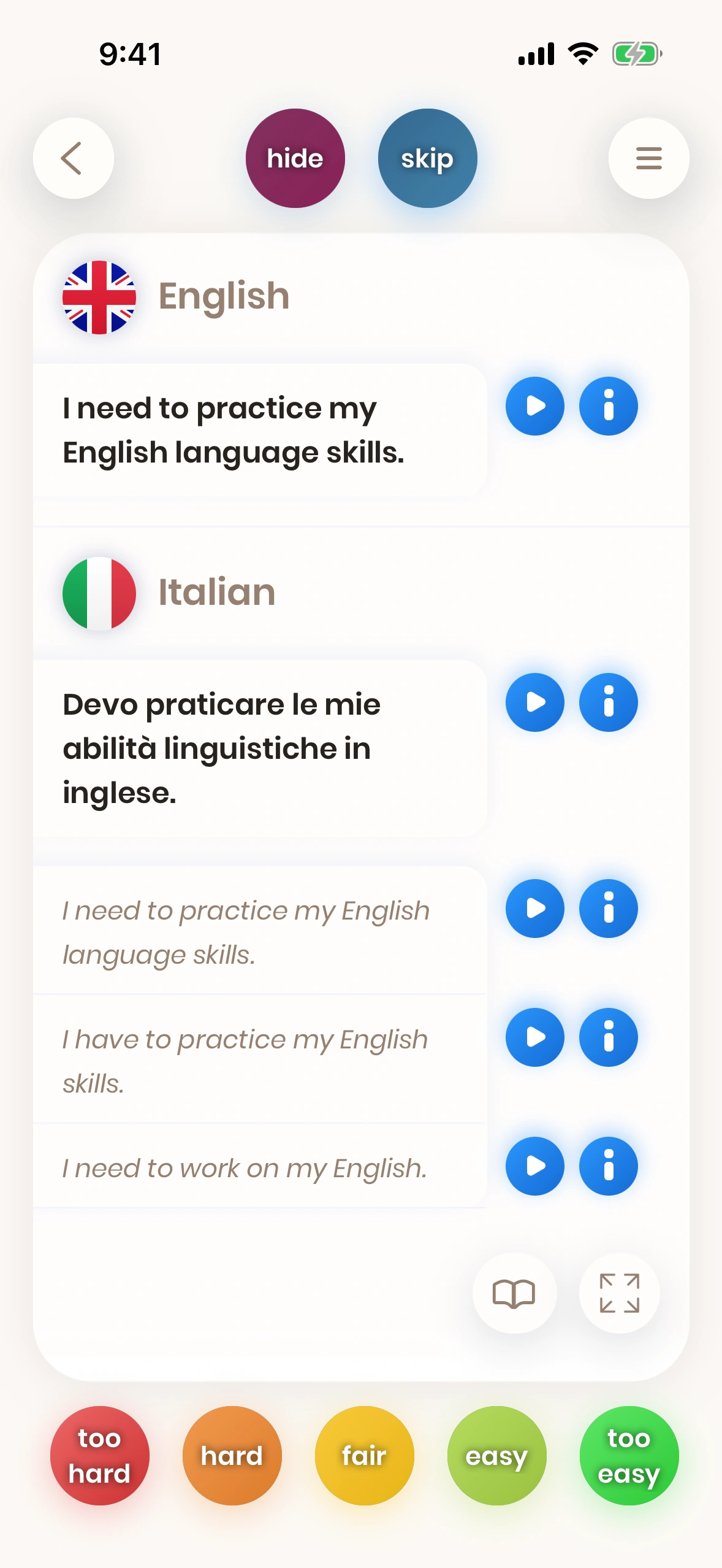Look at a card. Try to translate the word or phrase. Turn the card. Tell us how difficult it was. Difficult words and phrases are shown again soon.