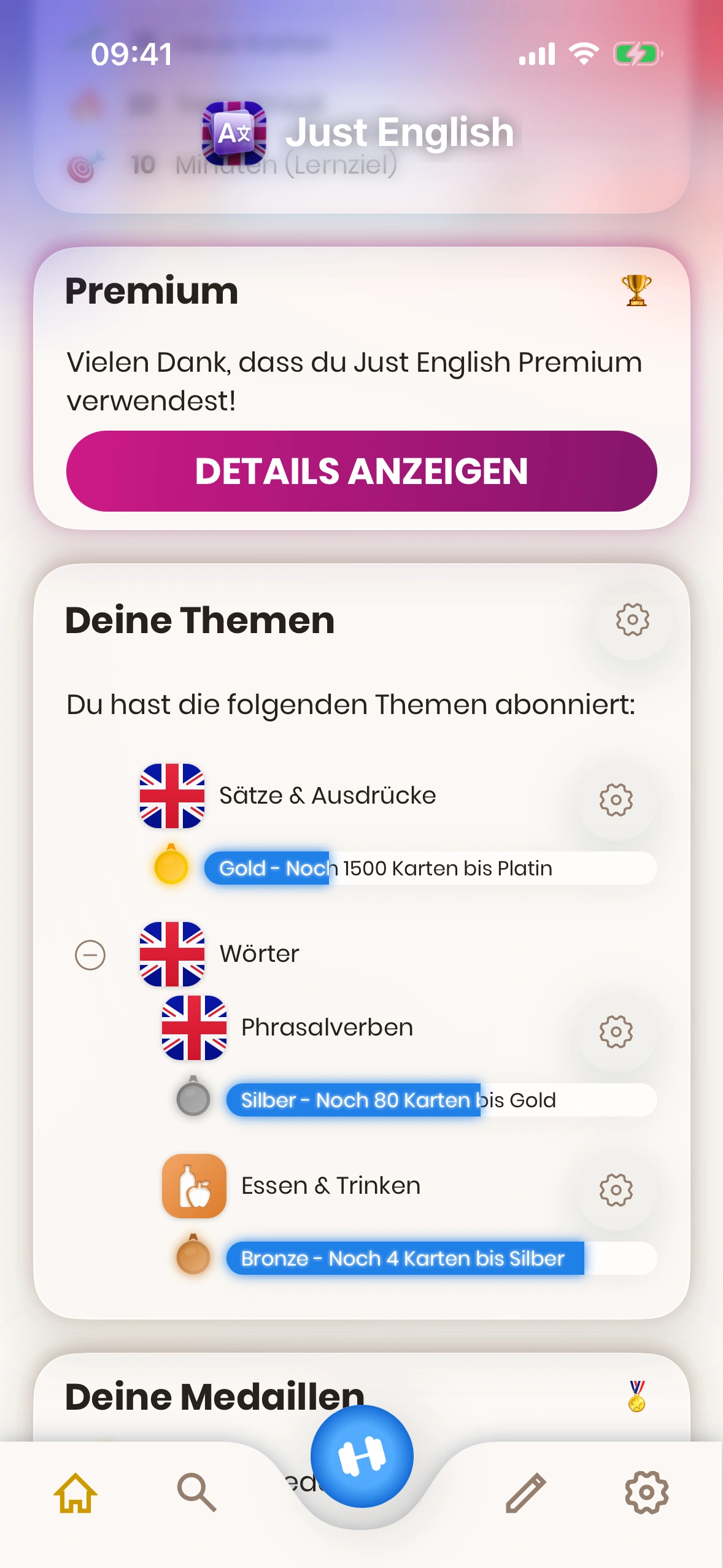 - Tägliches Lernziel: Hier siehst und änderst du dein tägliches Lernziel. Tippe auf den Stift, um es zu ändern.