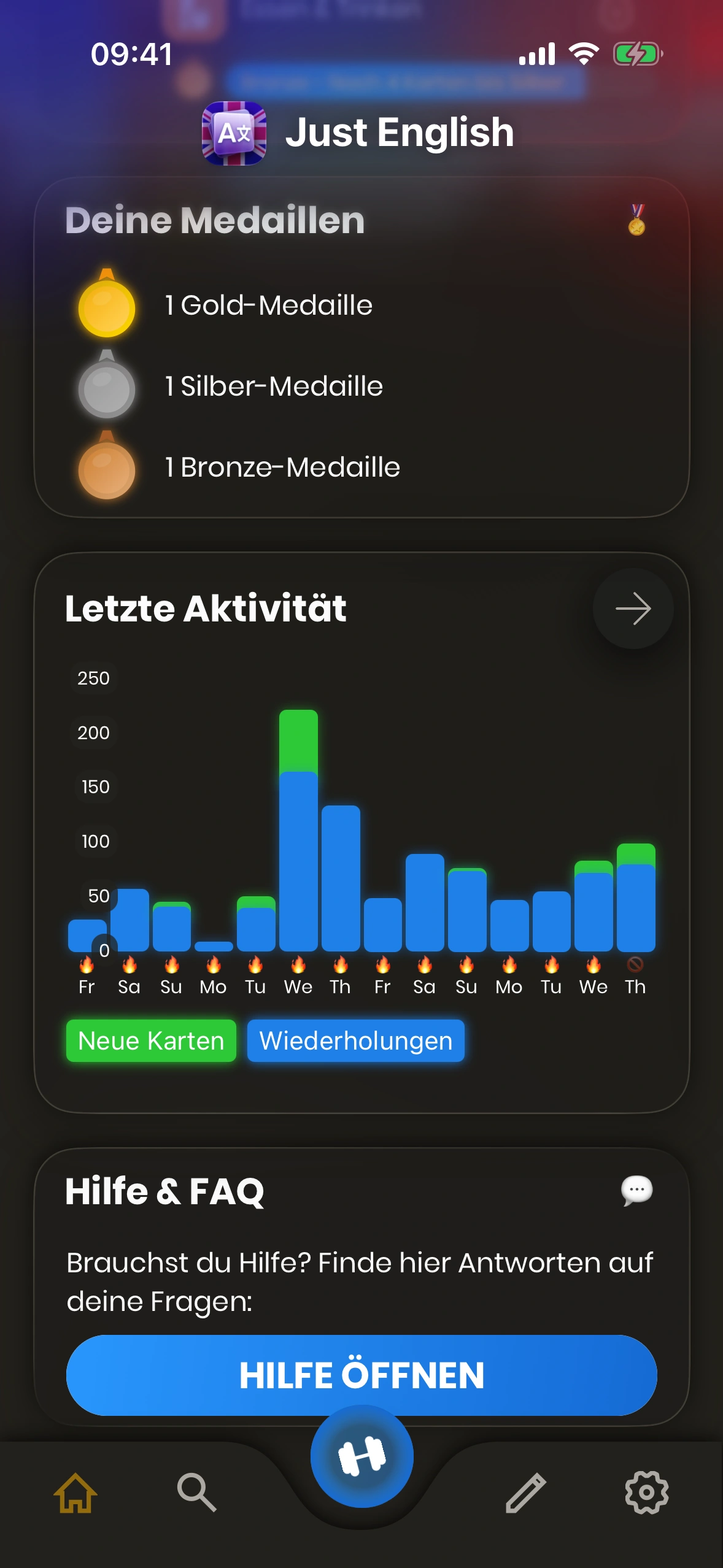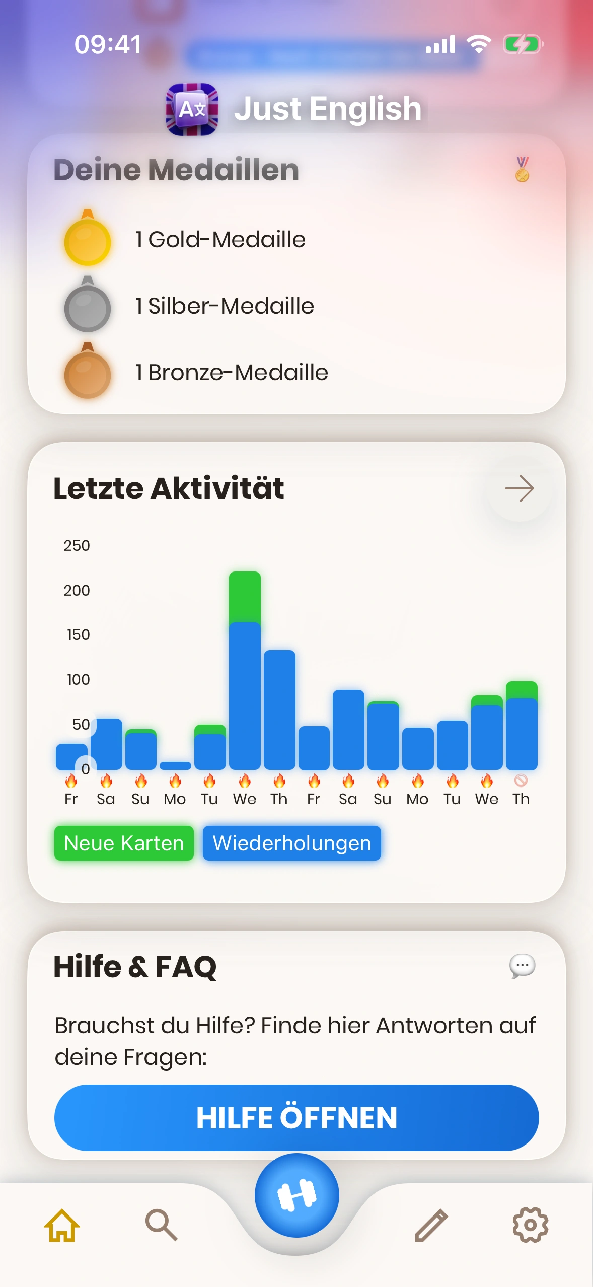 - Aktivität: Deine Aktivitäten der letzten Tage. Reviews in Blau, neue Karten in Grün. Tage mit 🔥 sind Streak‑Tage (Tagesziel erreicht). Über den Pfeil siehst du Details zur Verlaufshistorie.