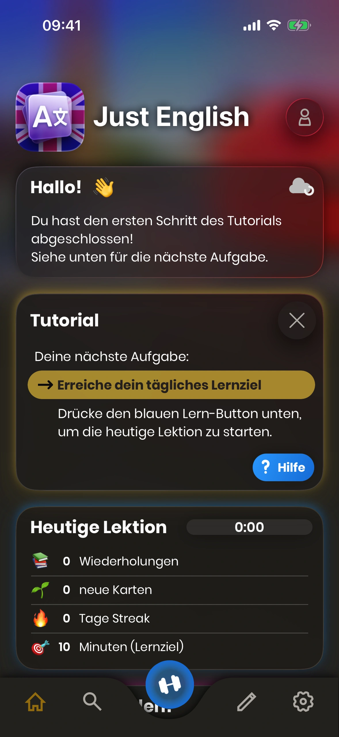 - Lernen‑Button: Startet deine tägliche Lernsitzung.
