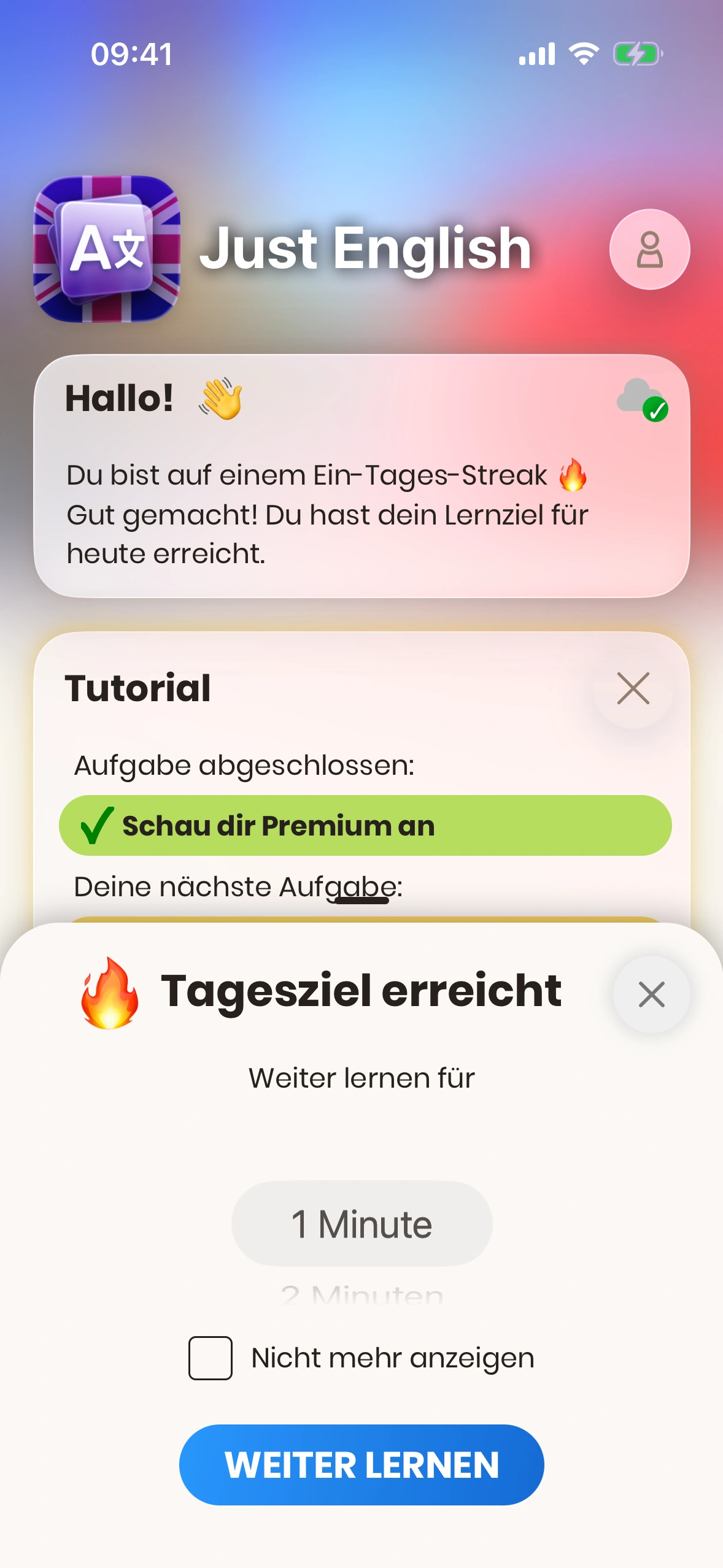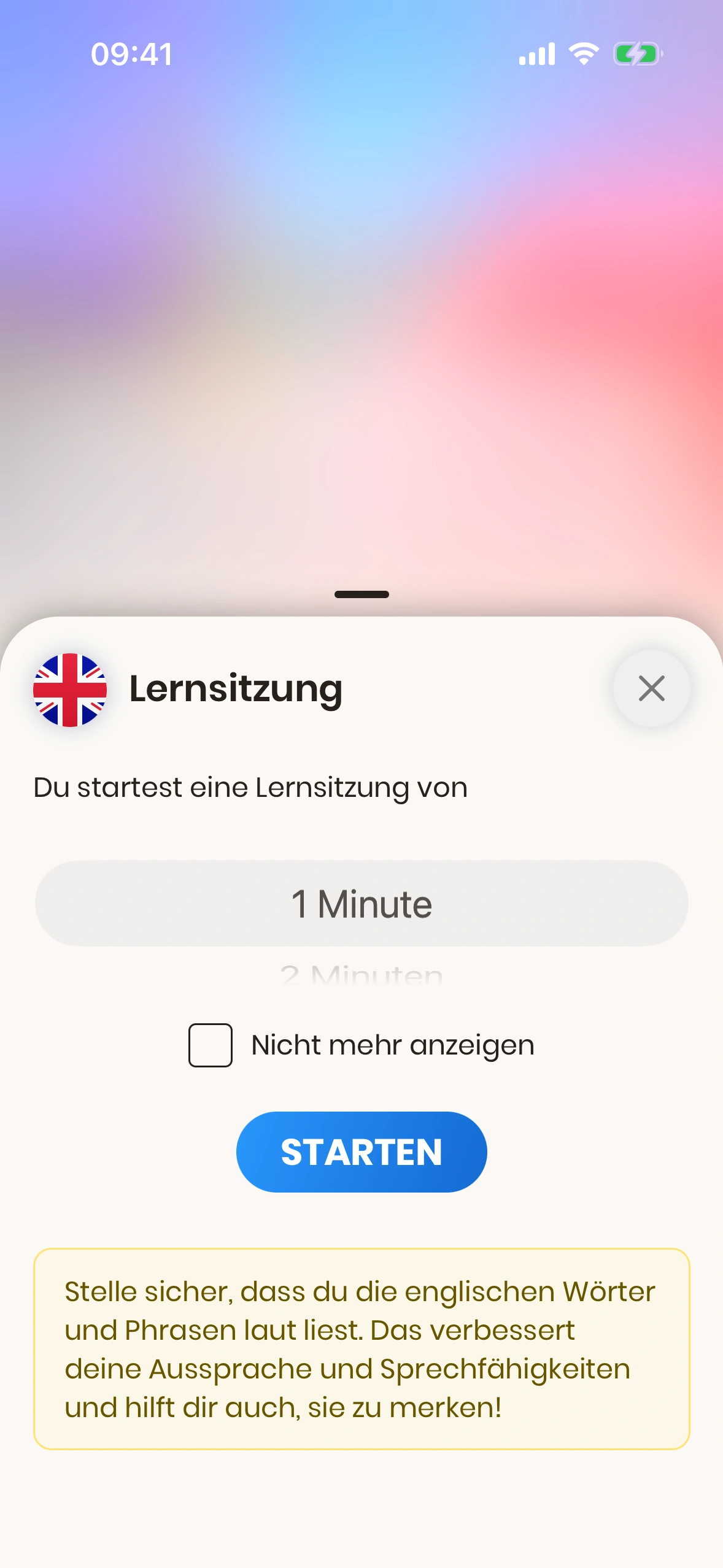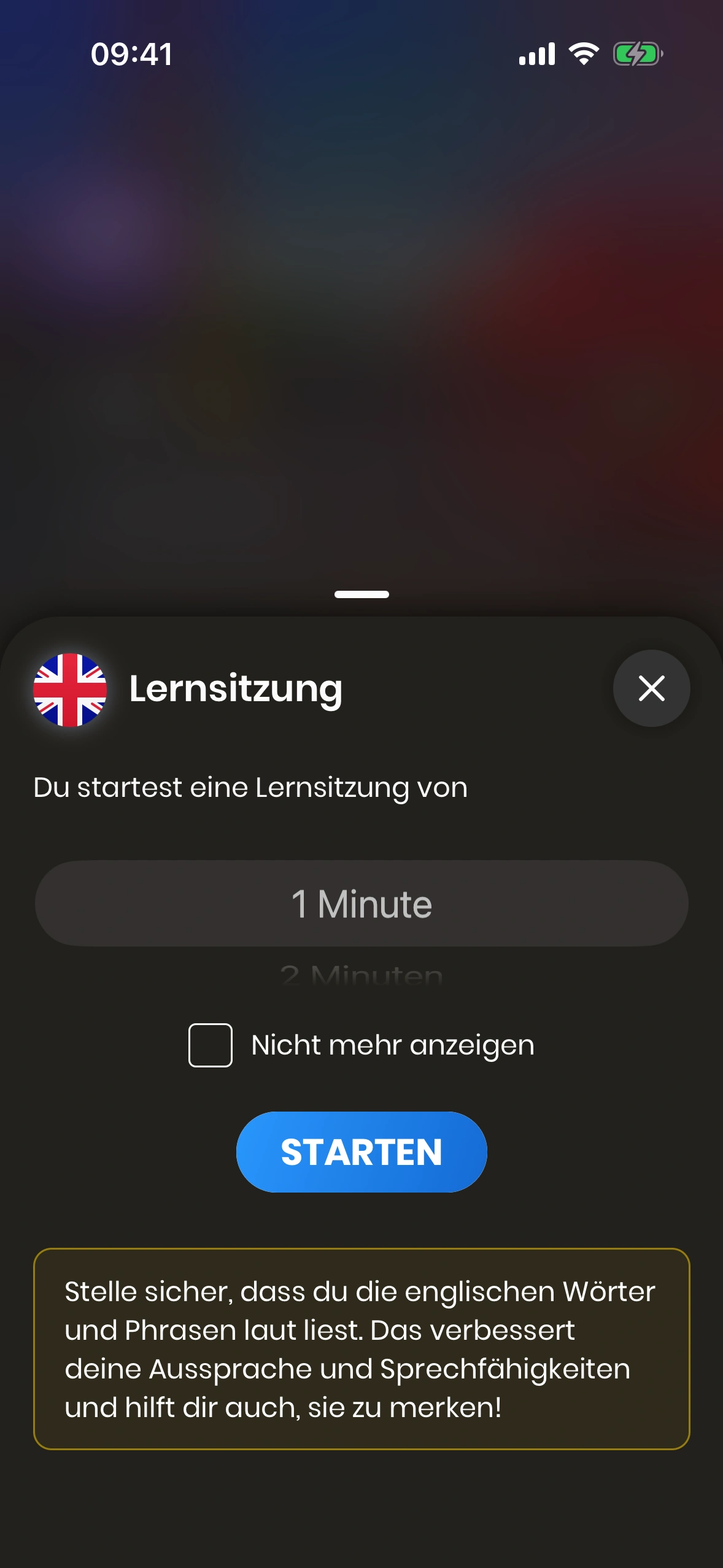 Dieses Bottom Sheet kann in den Einstellungen deaktiviert werden. Wenn es deaktiviert ist, startet die Lernsession sofort mit der Standarddauer.
