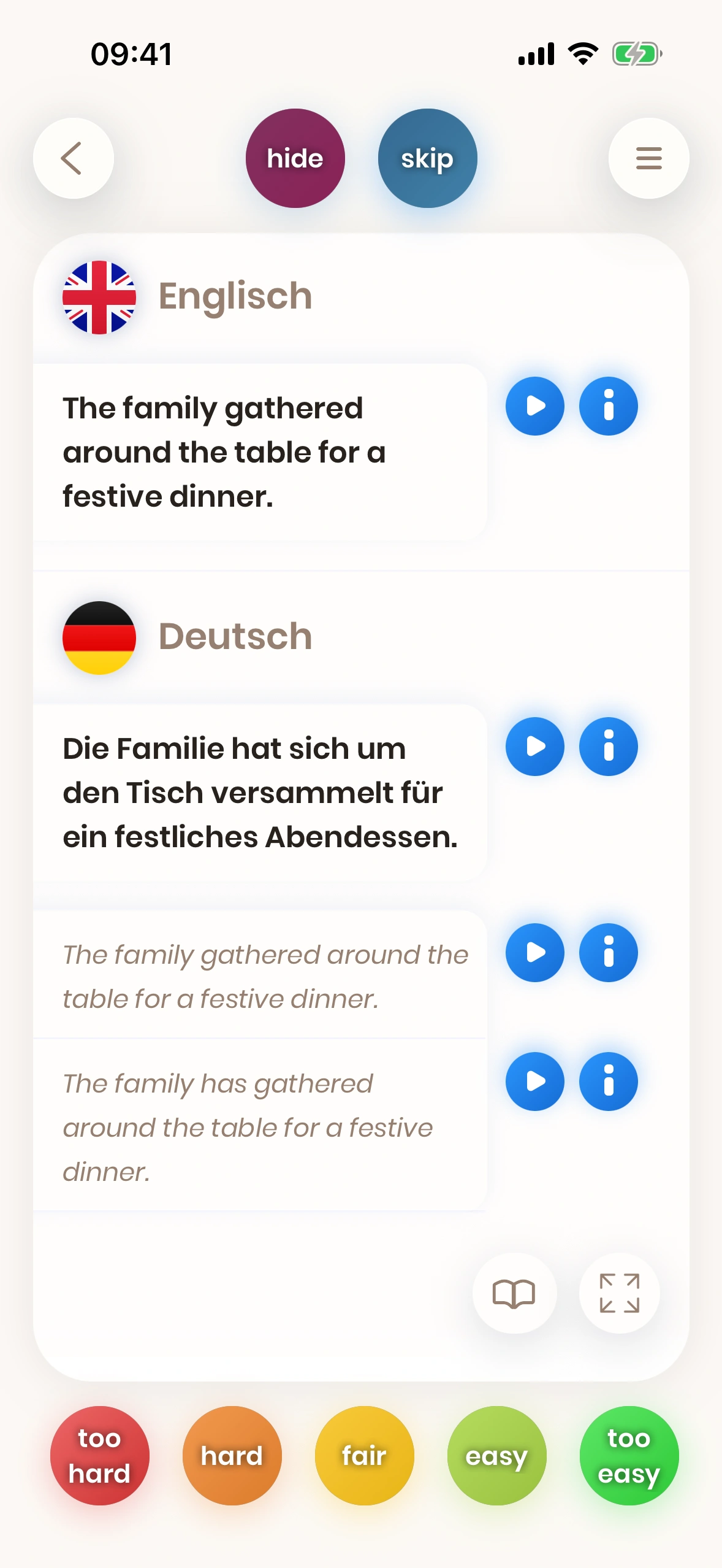 - Beispiel einblenden: Ist der Beispielsatz noch verborgen, blende ihn mit dem grauen (+) ein.