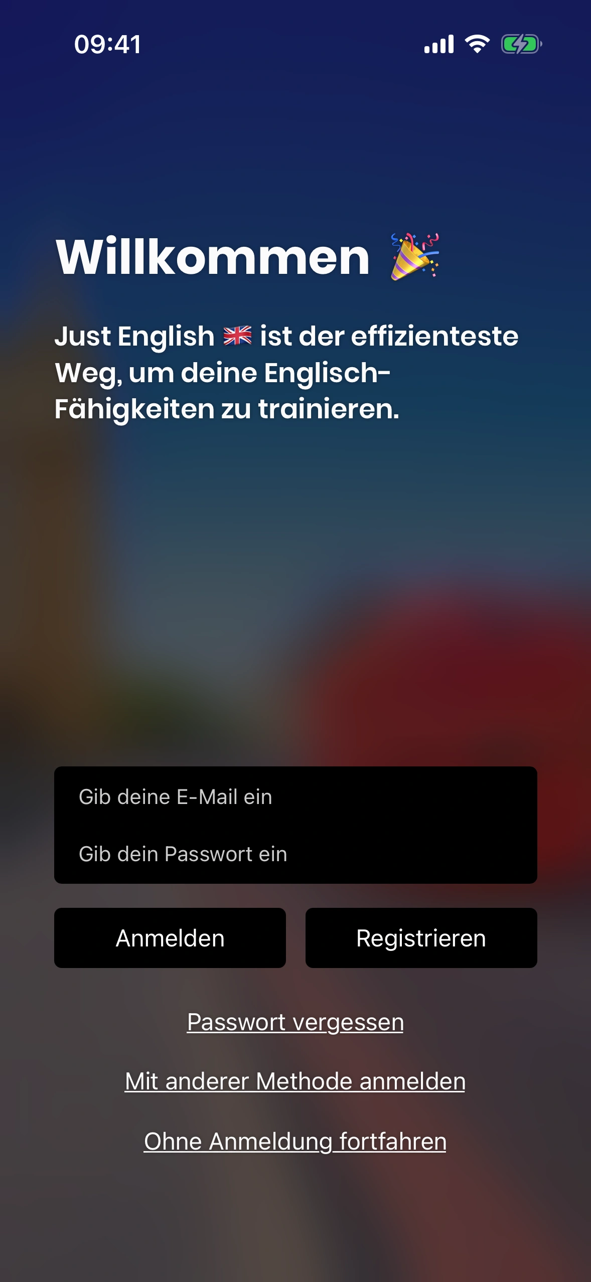 Aktuell bietet Just English zwei Möglichkeiten, dich anzumelden: