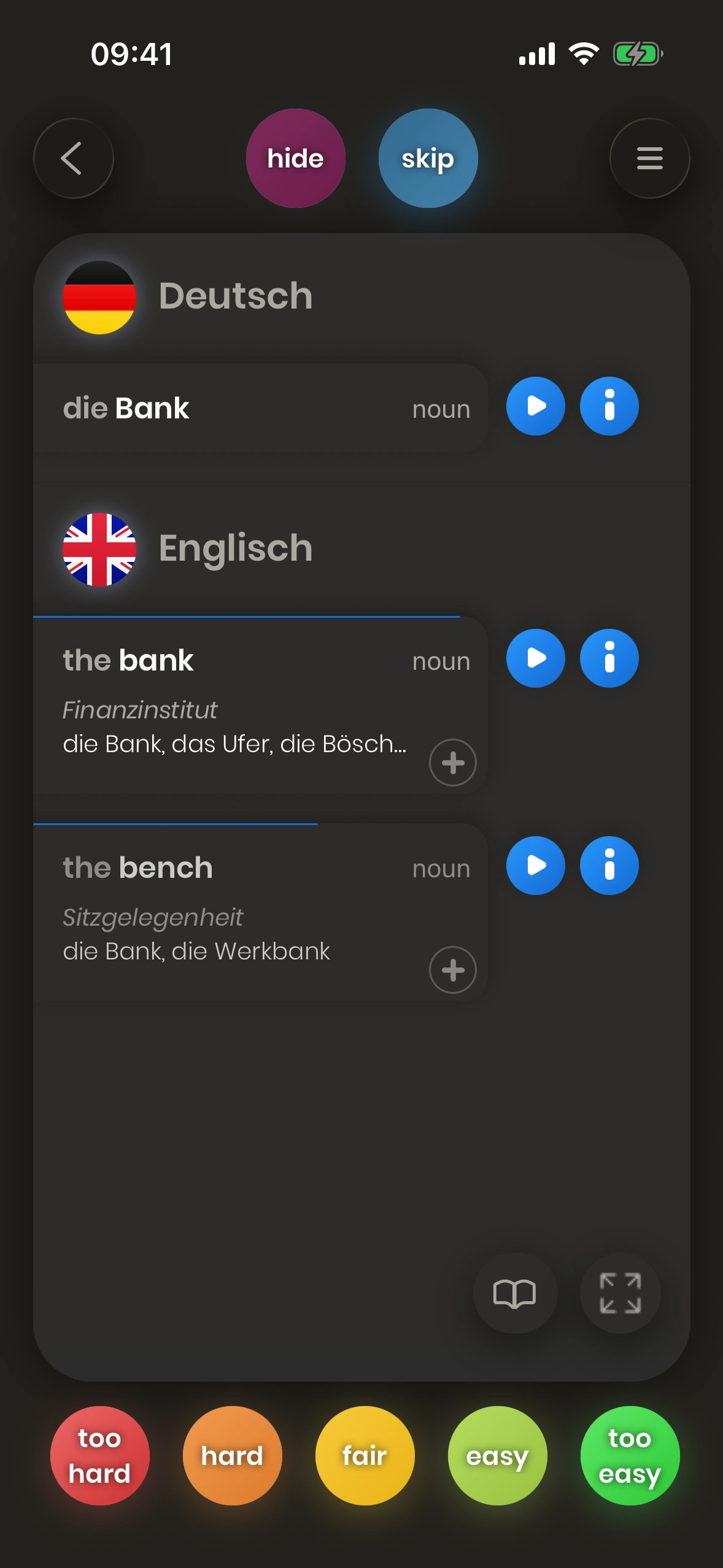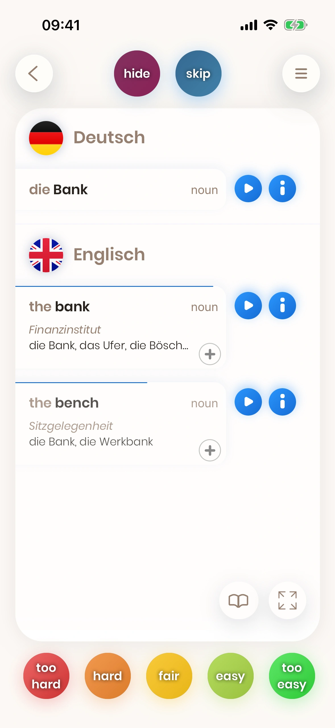 Du musst nicht alle kennen: Kannst du eine der ersten Übersetzungen nennen, gilt die Karte als „gelernt“. Mehr Details später.