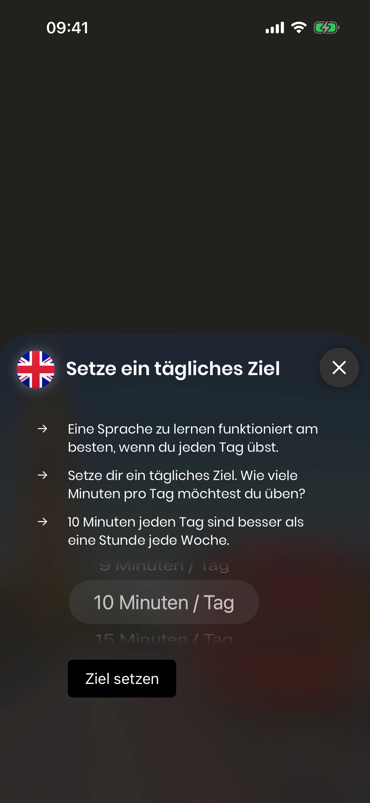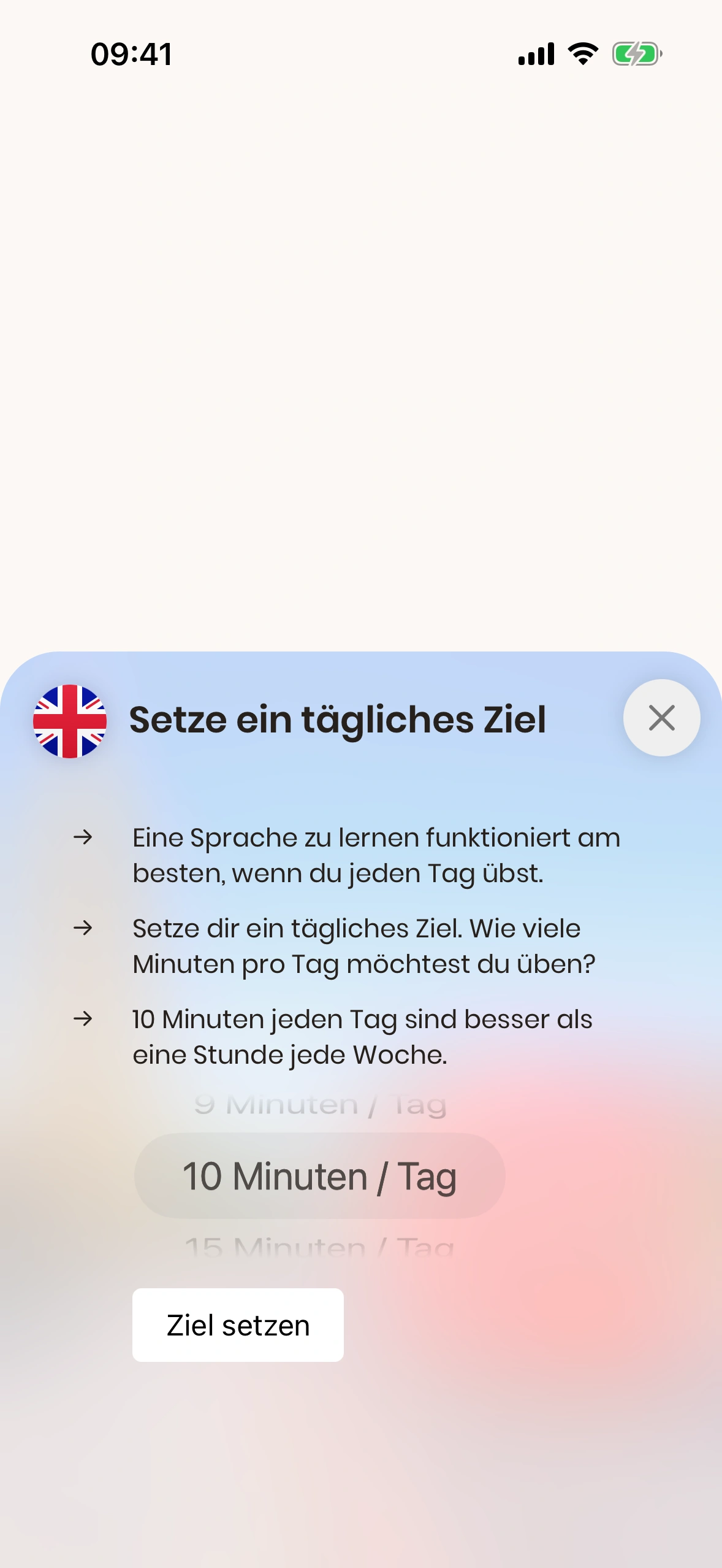 Wenn du nach Erreichen deines Tagesziels Lust hast weiterzulernen, kannst du natürlich so lange weitermachen, wie du möchtest. Viele setzen sich 3, 5 oder 10 Minuten als Ziel, verbringen aber gelegentlich (z. B. am Sonntag) auch mal eine Stunde in der App, um richtig zu vertiefen.