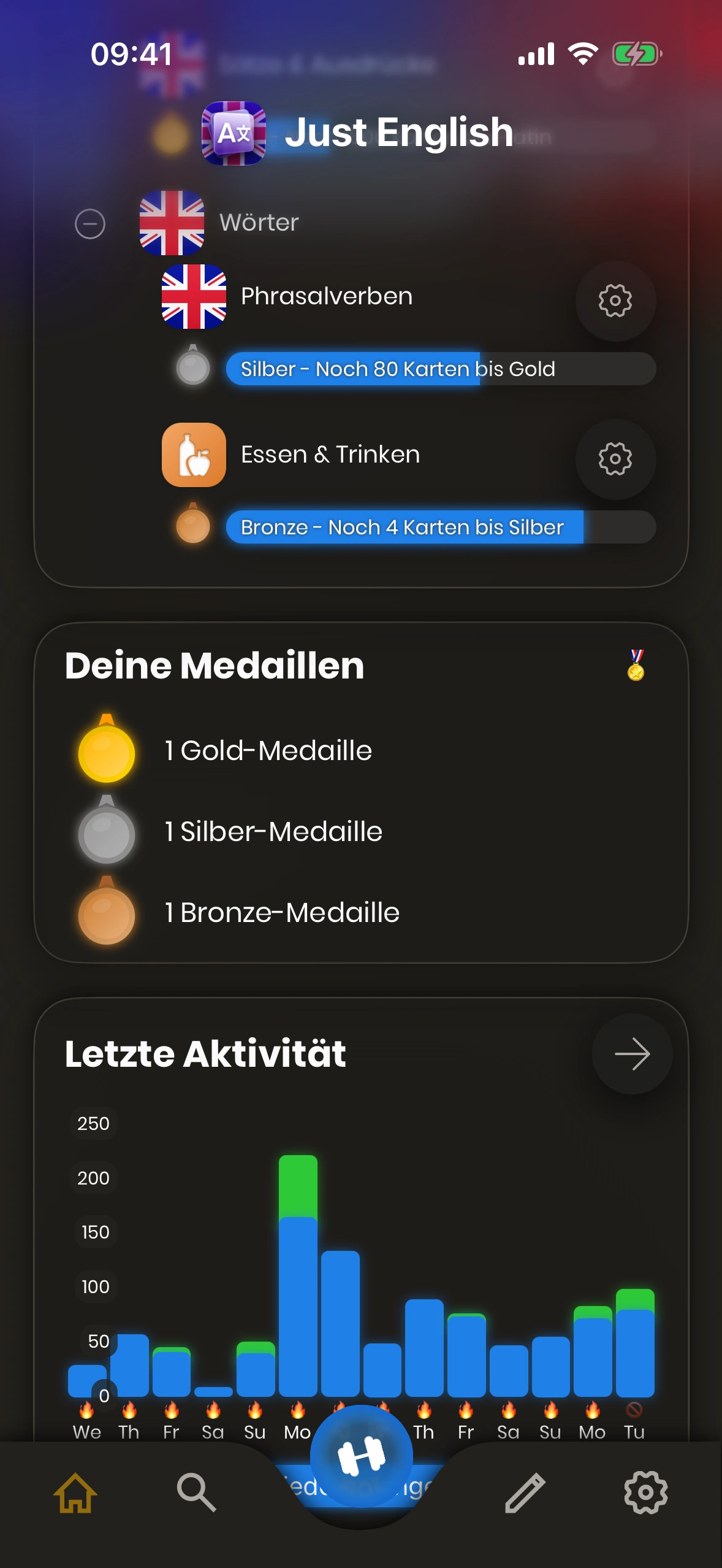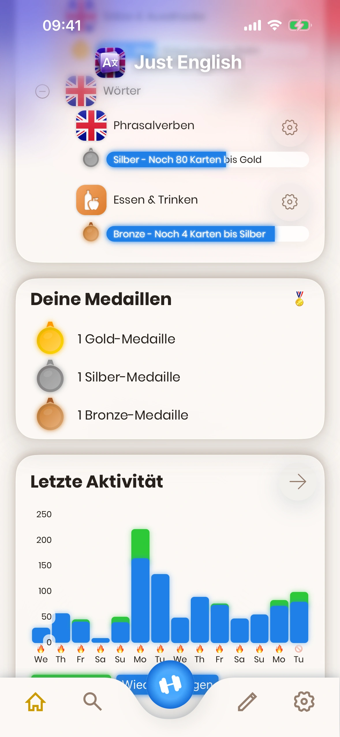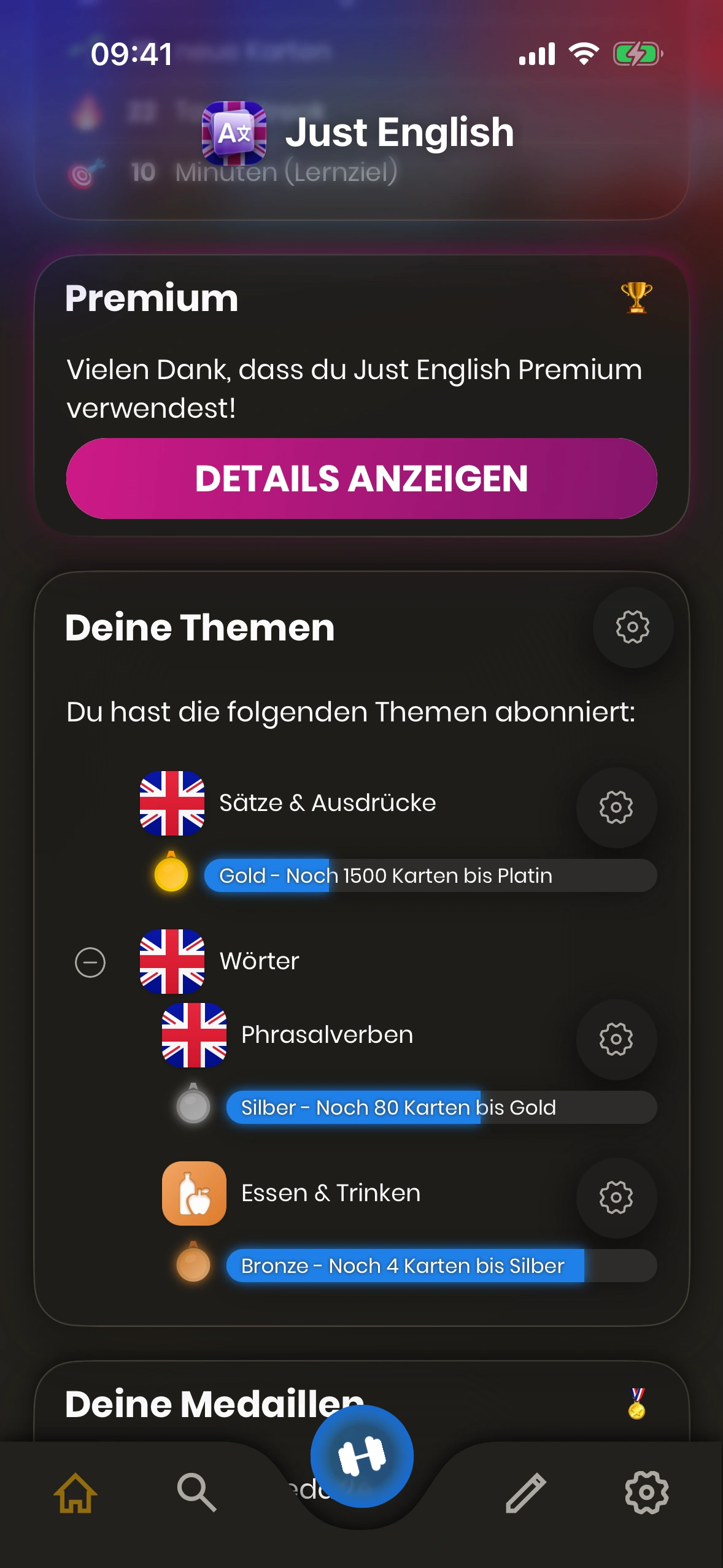 - Tägliches Lernziel: Hier siehst und änderst du dein tägliches Lernziel. Tippe auf den Stift, um es zu ändern.