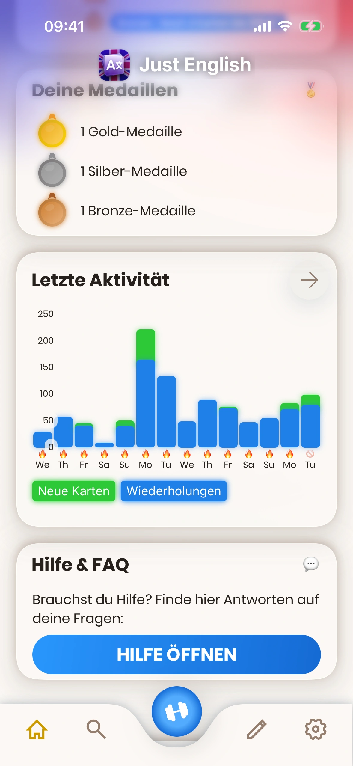 - Aktivität: Deine Aktivitäten der letzten Tage. Reviews in Blau, neue Karten in Grün. Tage mit 🔥 sind Streak‑Tage (Tagesziel erreicht). Über den Pfeil siehst du Details zur Verlaufshistorie.
