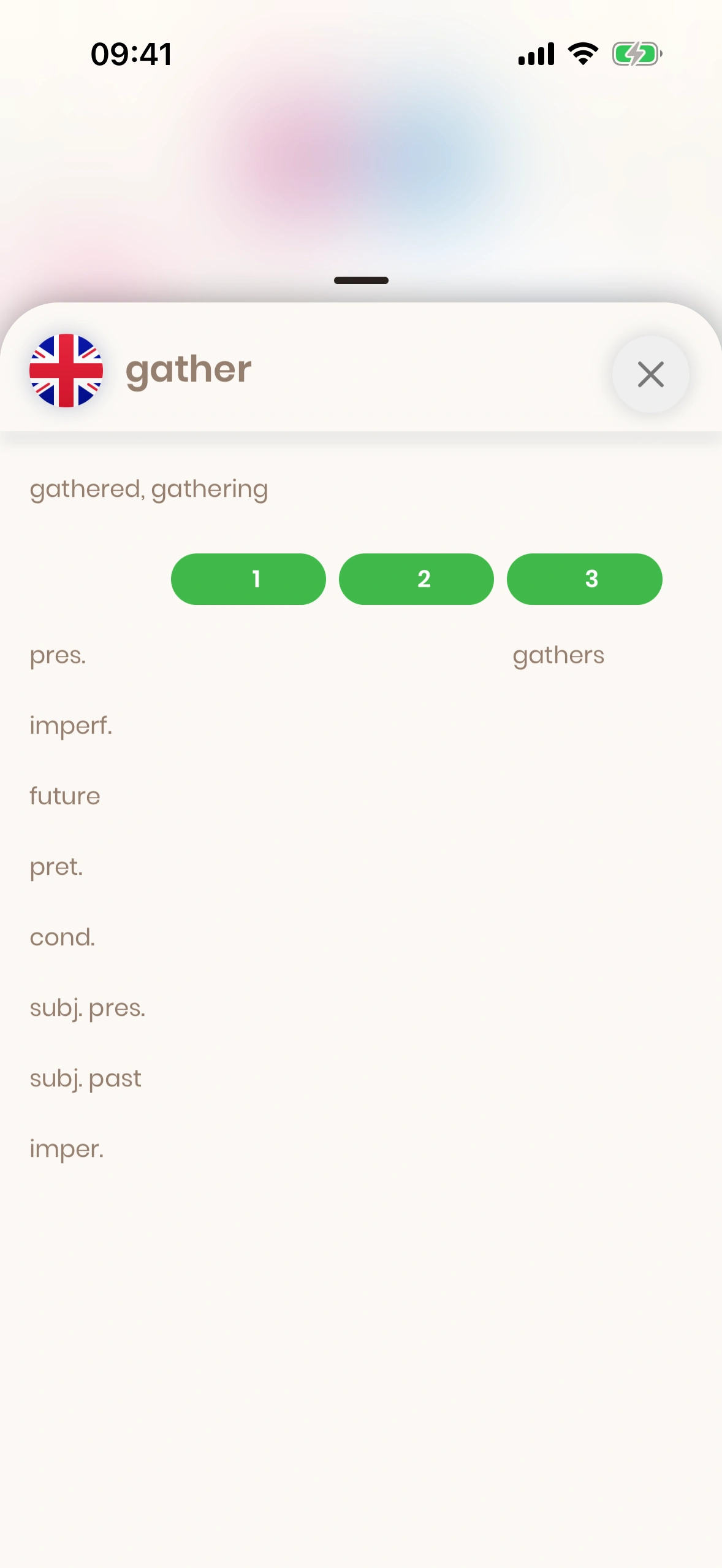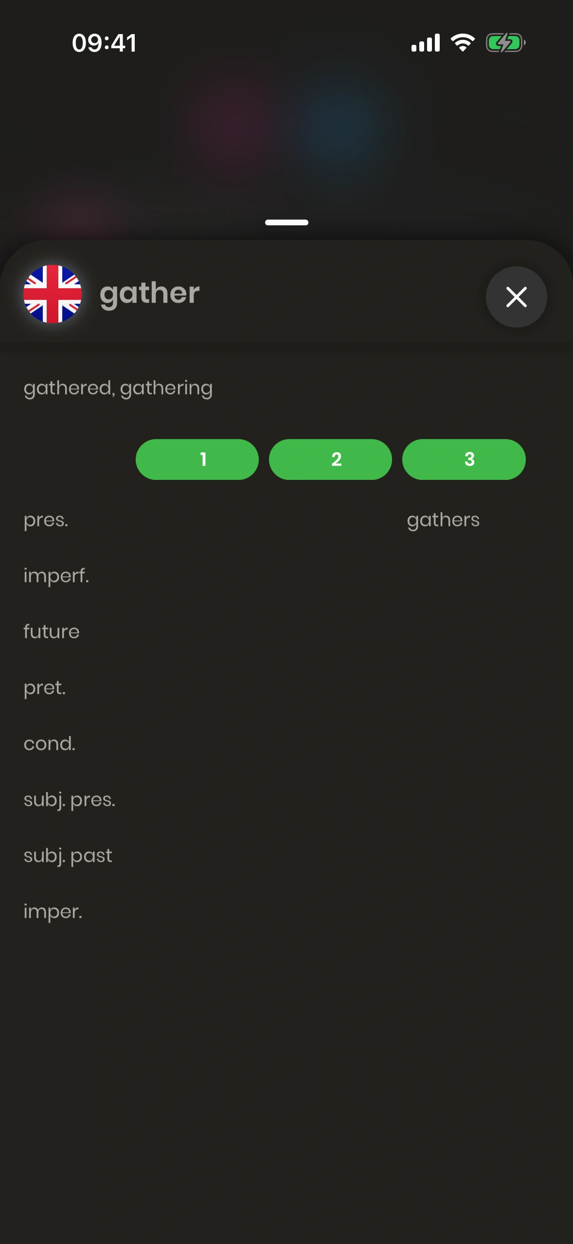 Der Konjugations‑Dialog zeigt die Konjugation eines Verbs. Tippe beim Verb auf den Hinzufügen‑Button und dann auf „Konjugationstabelle".