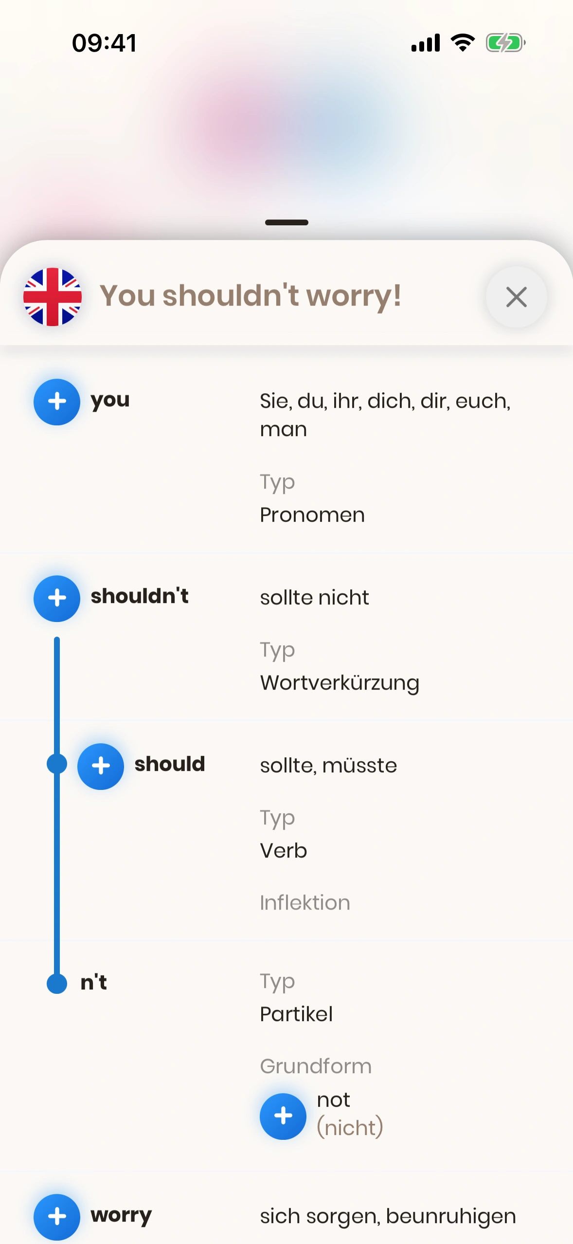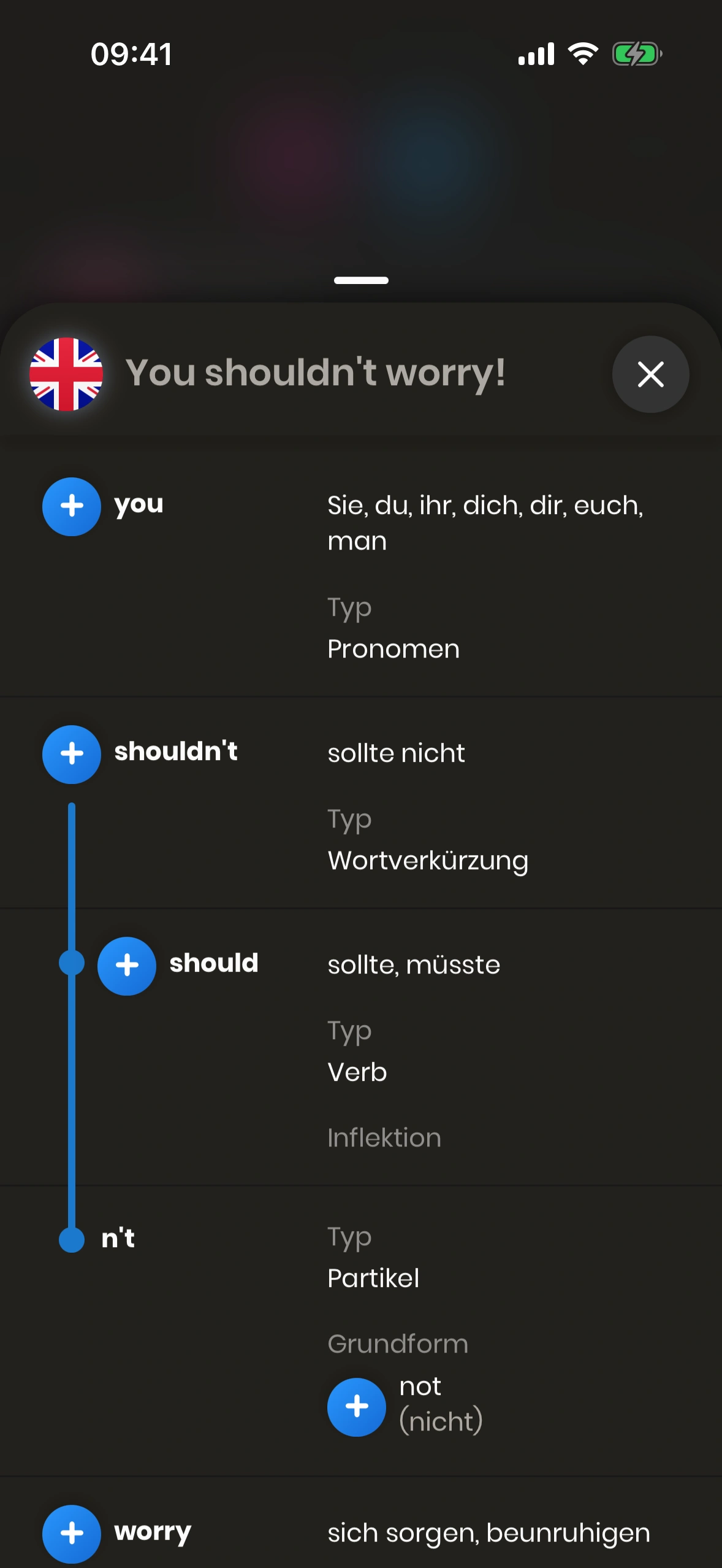 Der Satzstruktur‑Dialog erscheint, wenn du bei einer Satzkarte auf das (i) tippst – neben dem Satz in der Zielsprache.