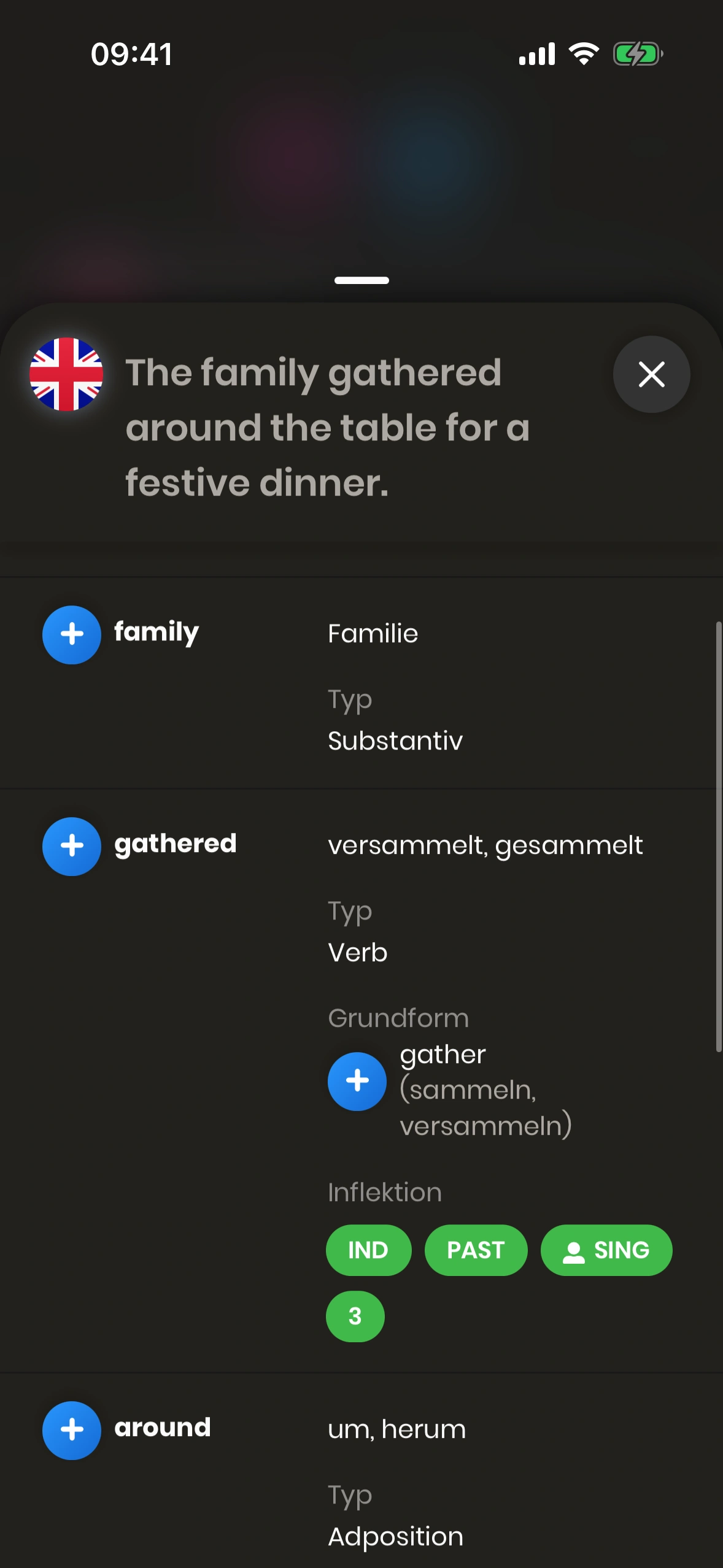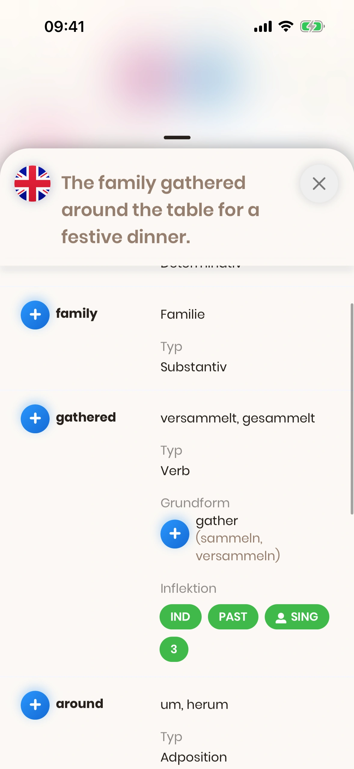 7. Grundform: Bei gebeugten Wörtern zeigen wir die Grundform mit Übersetzungen.