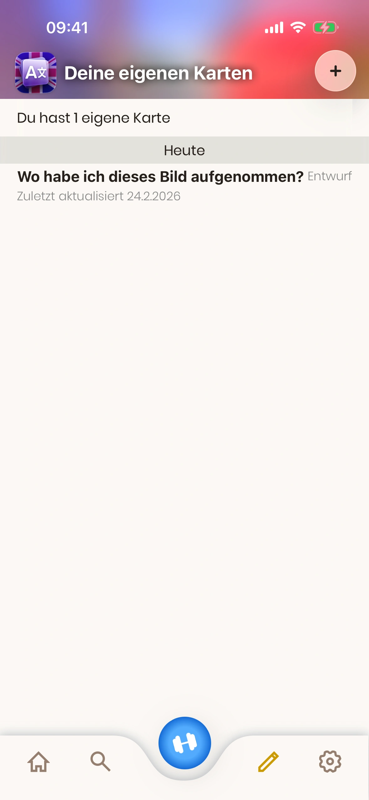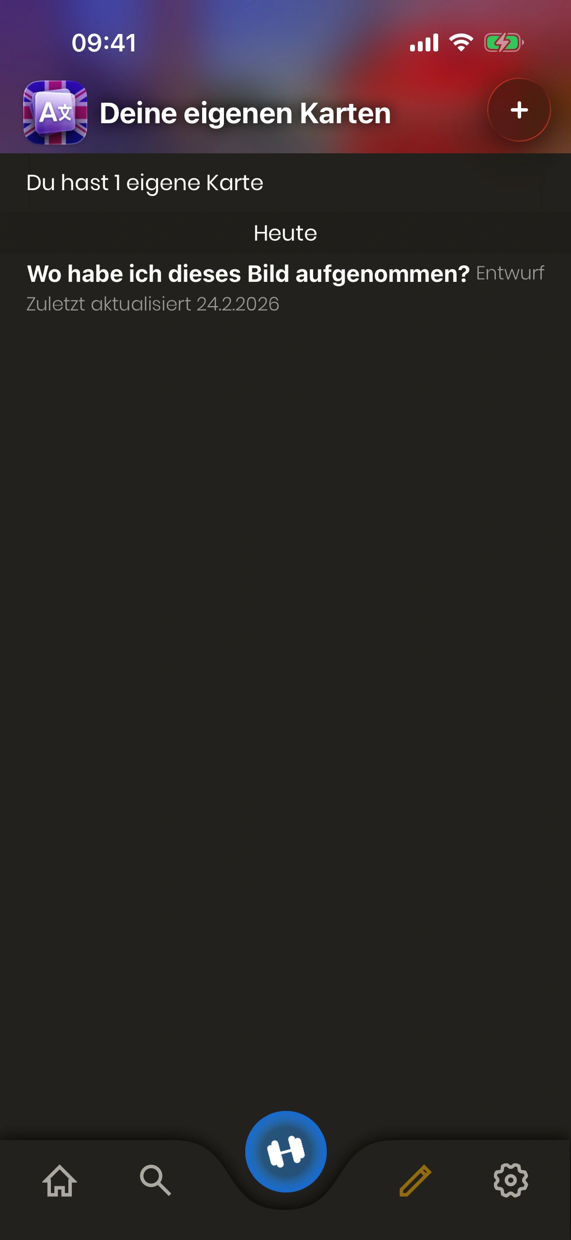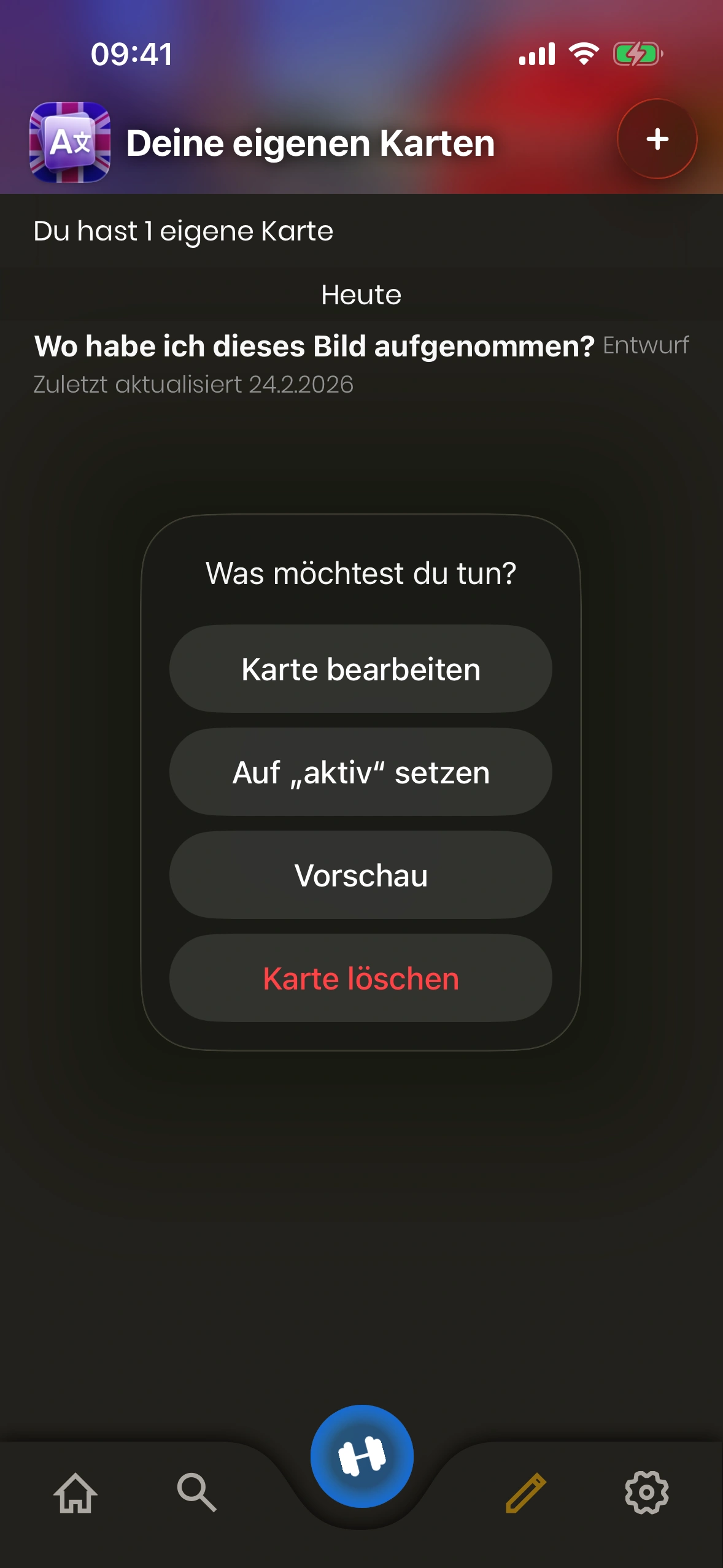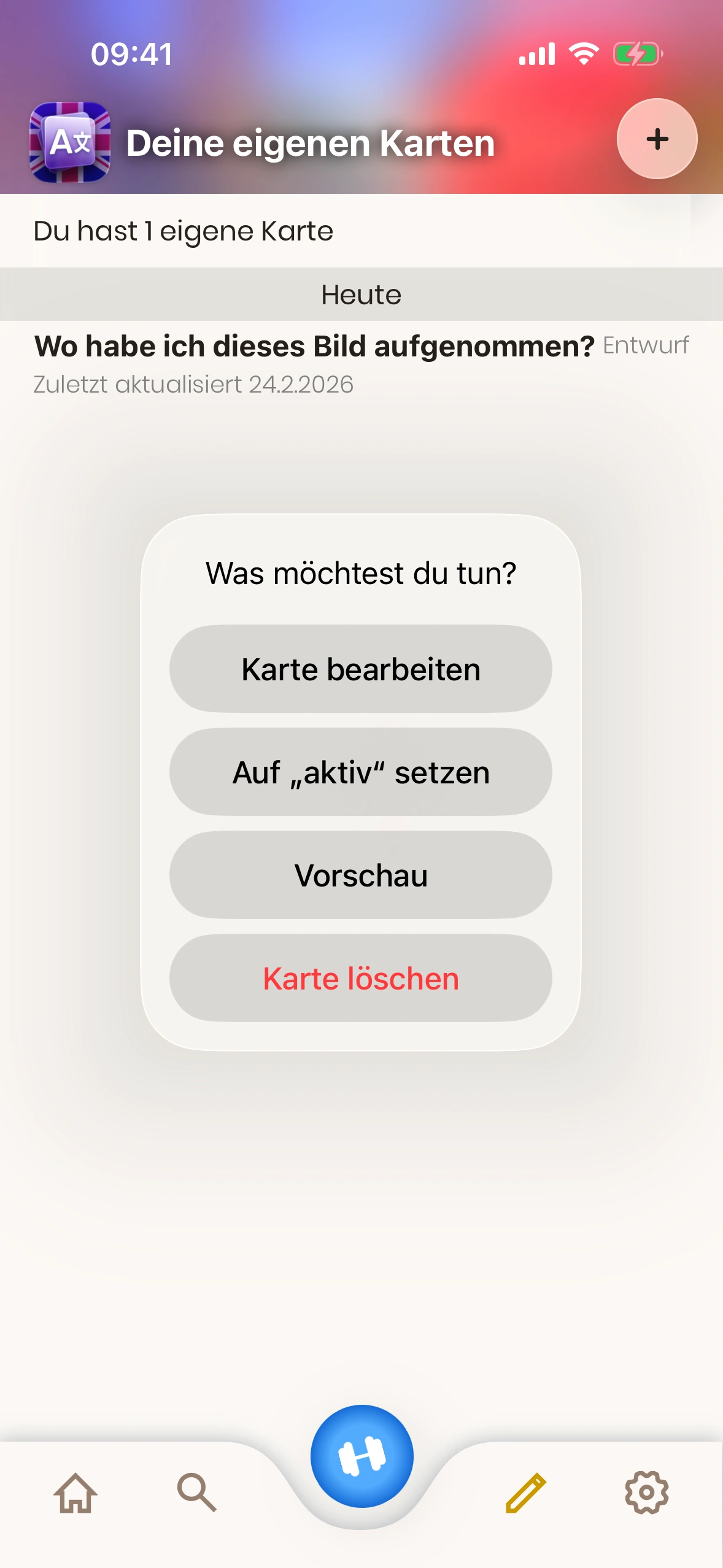 - Kartenstatus: Eine Eigene Karte ist entweder „Entwurf“ oder „Aktiv“. Entwürfe werden beim Lernen nicht gezeigt. Tippe die Karte, um den Status zu ändern.