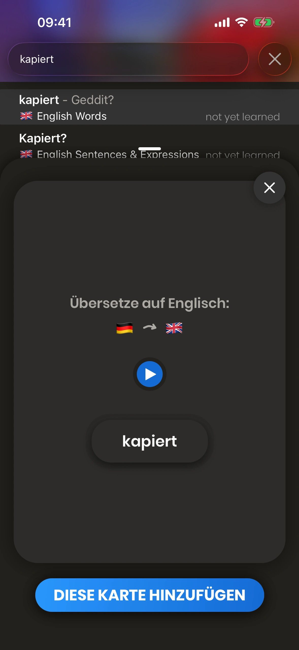 Wenn du die Übersetzung eines Wortes nicht kennst, schlage es im Wörterbuch nach und füge die Karte über „ADD THIS CARD“ hinzu.