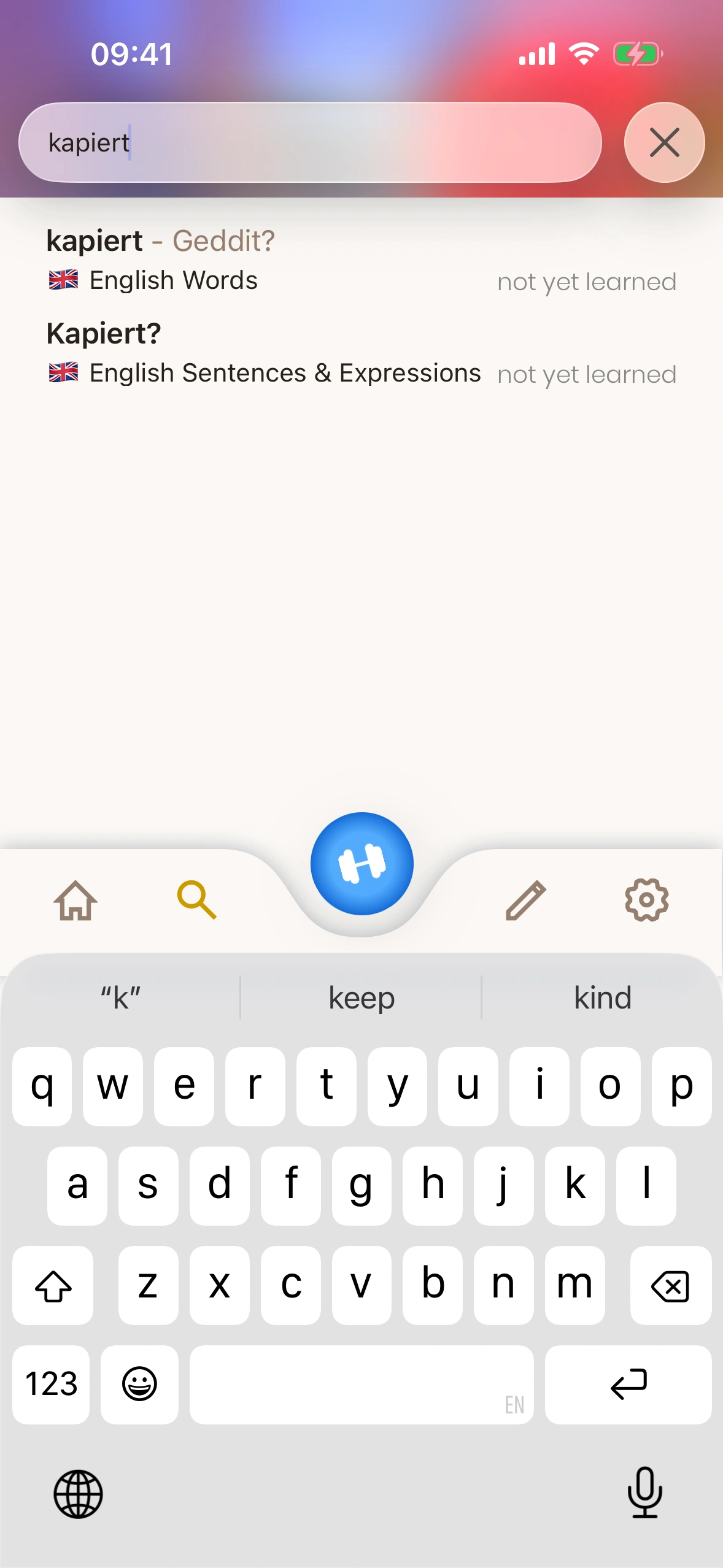 Just English bietet ein vollwertiges Wörterbuch – jeder Eintrag ist eine Karte, die du zu deiner Lern‑Warteschlange hinzufügen kannst!