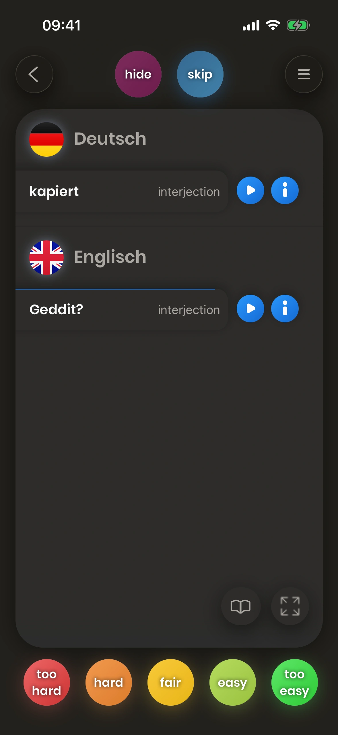 Wenn die Übersetzung eines Wortes oder einer Phrase für dich schwierig ist, dann musst du es öfter üben. Aus diesem Grund wird die Karte bald wieder gezeigt, wenn du einen roten Button wie too hard drückst, damit du das Wort oder die Phrase öfter üben kannst.