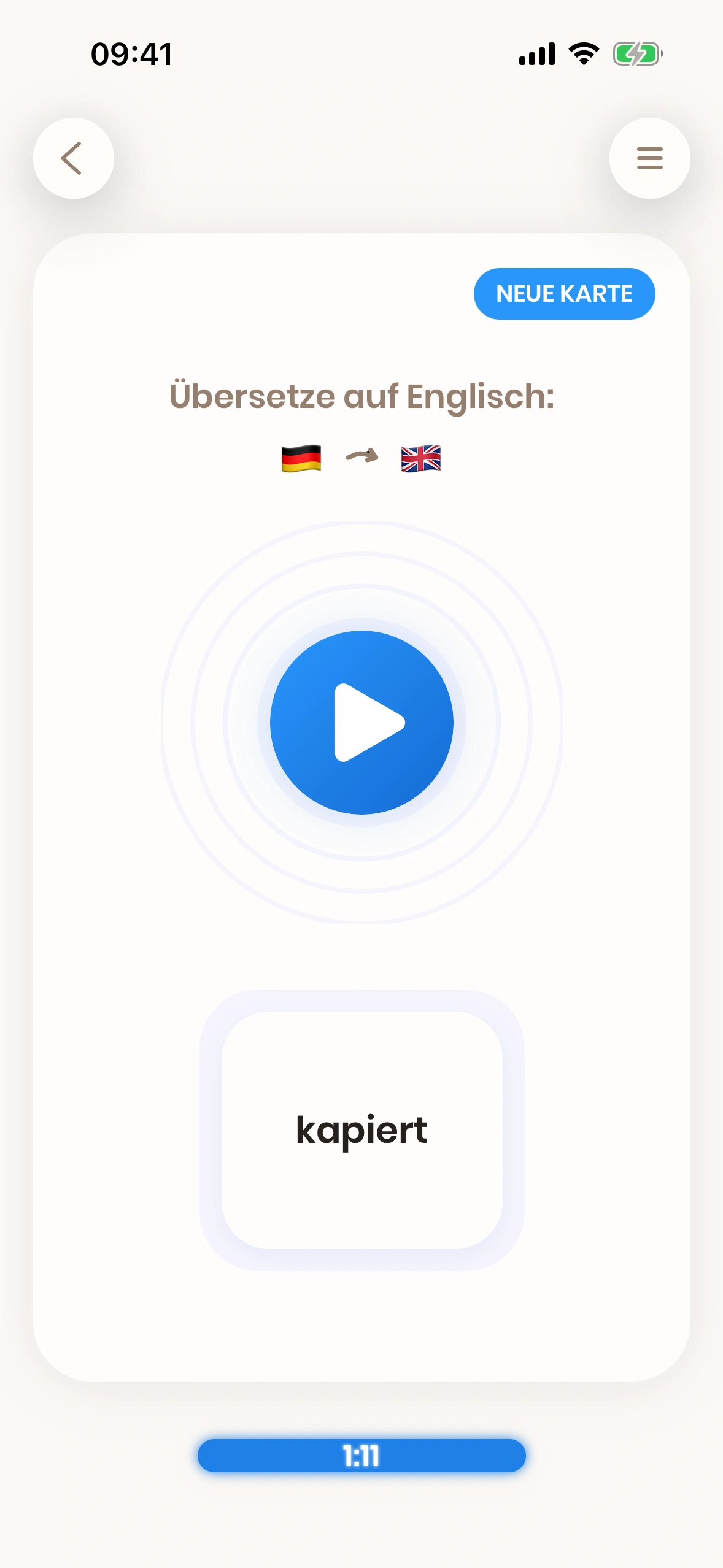 Just English ist eine Karteikarten-basierte App. Karteikarten sind Karten, die sowohl eine Vorder- als auch eine Rückseite haben. Du schaust dir die Vorderseite an und versuchst, das Wort (oder die Phrase) darauf zu übersetzen.