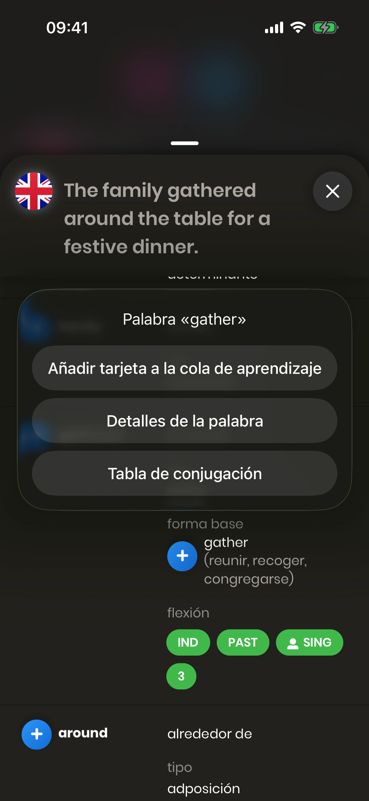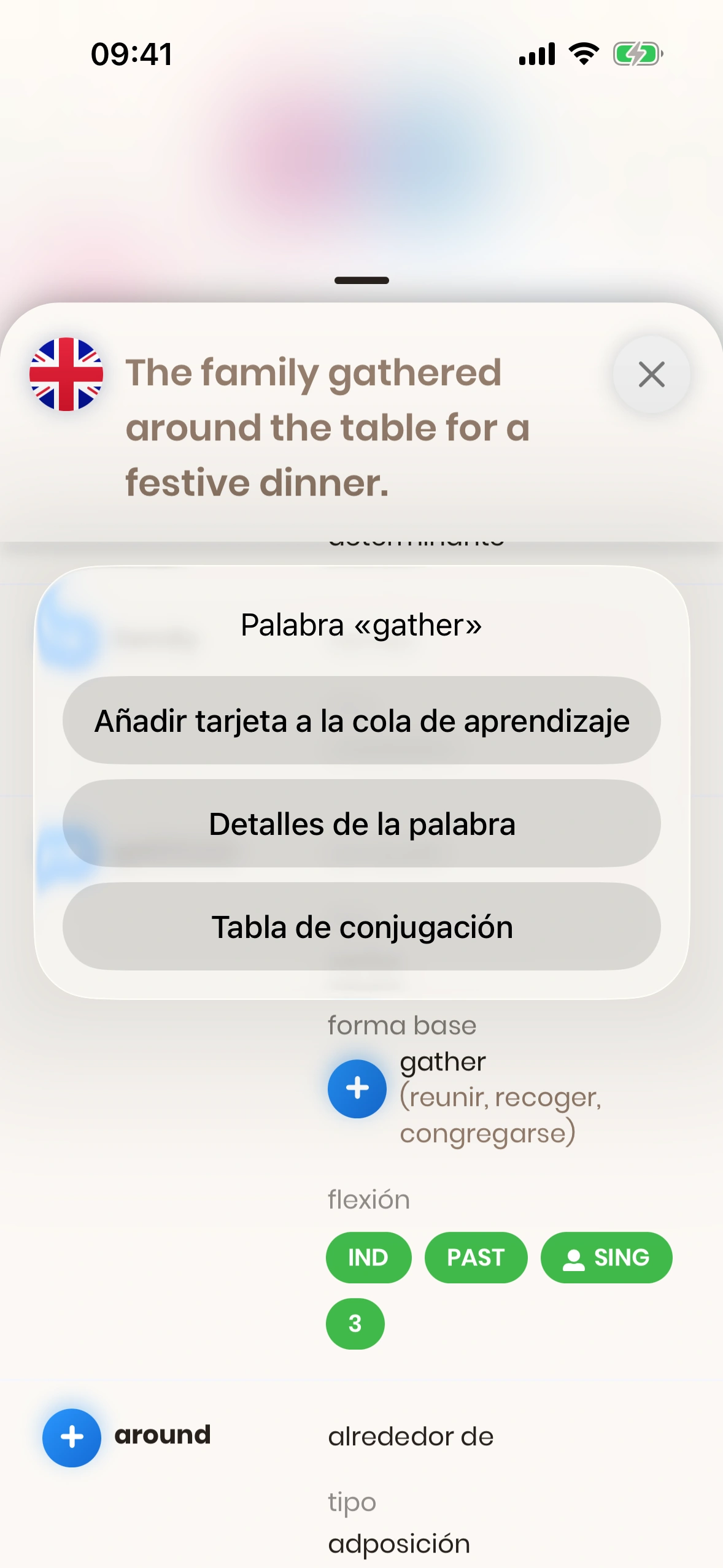 - Añadir tarjeta a la cola de aprendizaje: Añade la palabra seleccionada como tarjeta propia a tu cola de aprendizaje.