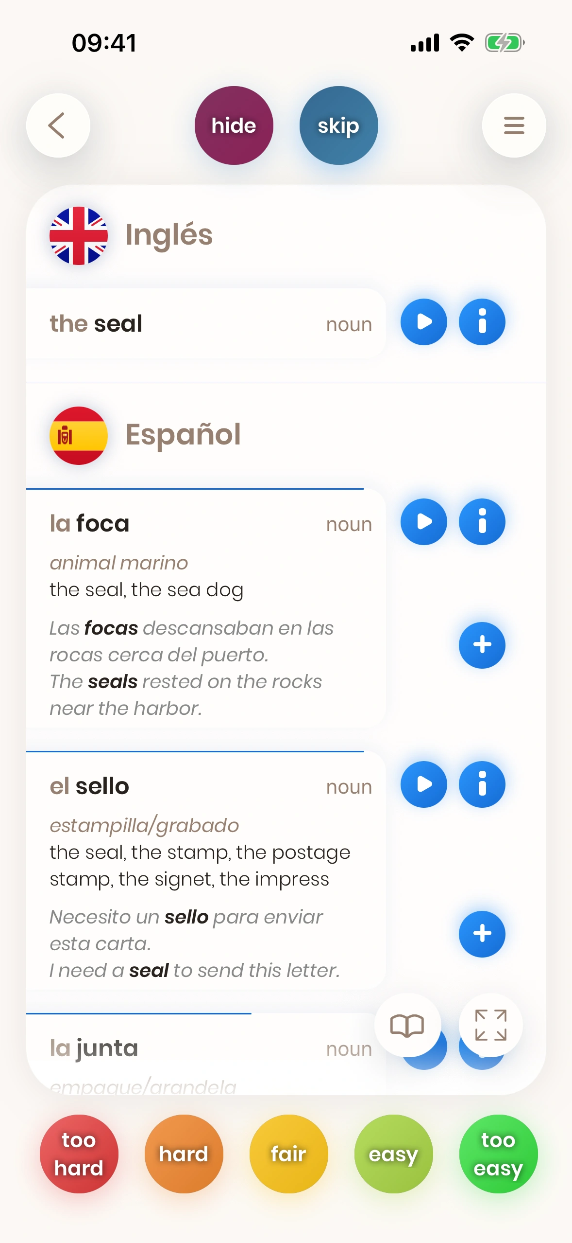 Recordar estas diferencias sutiles es difícil. Con Just English puedes practicarlas en contexto. La forma más fácil de recordar qué significa "seal" en inglés es añadir estas frases de ejemplo a tu cola de aprendizaje.