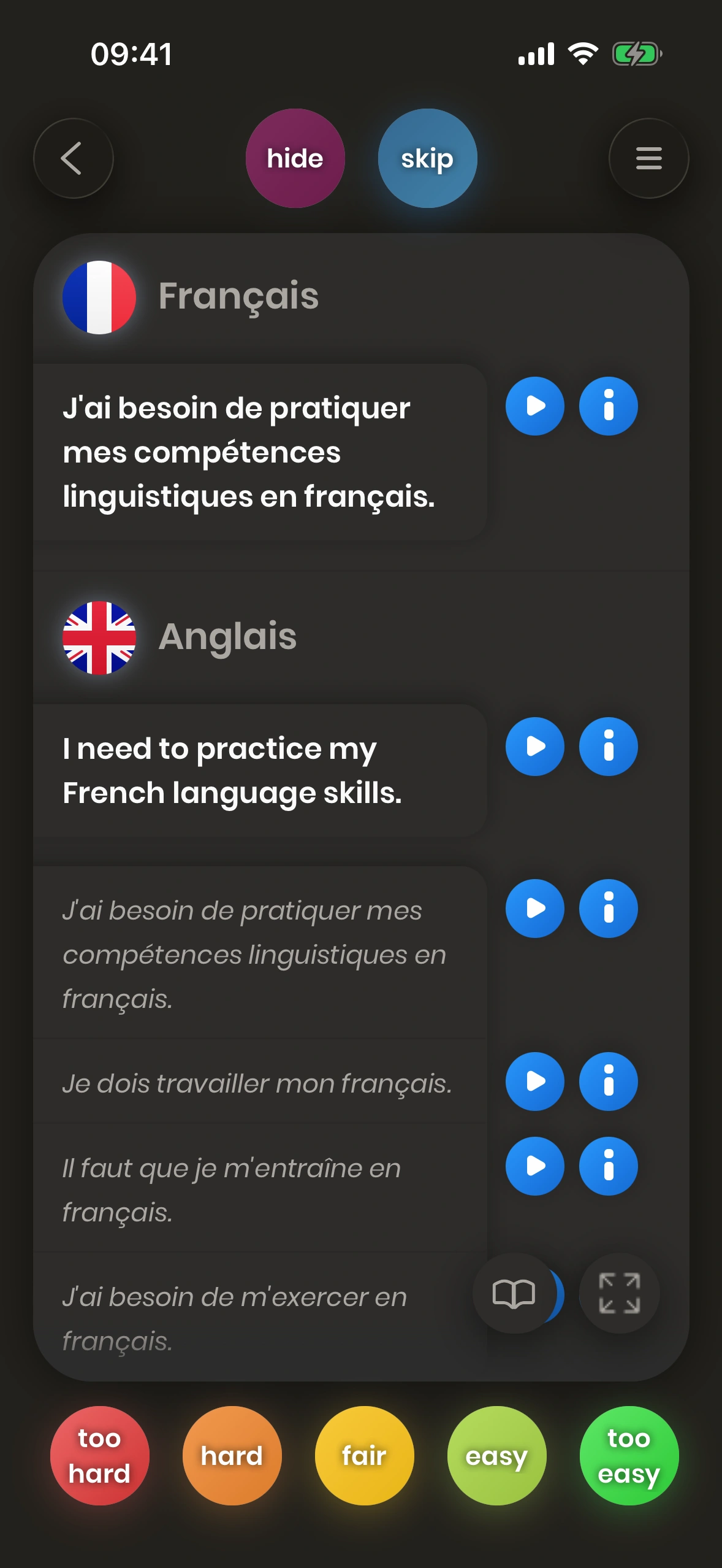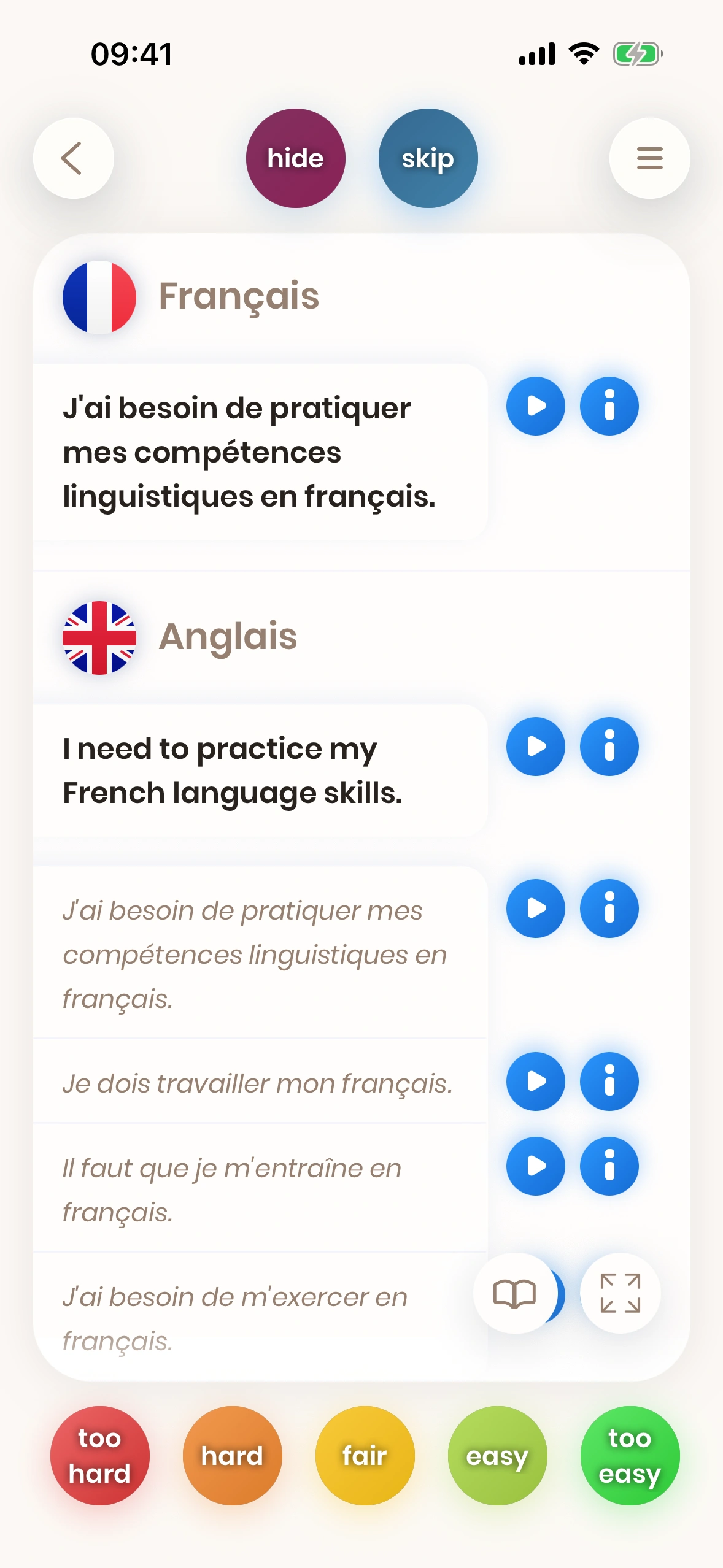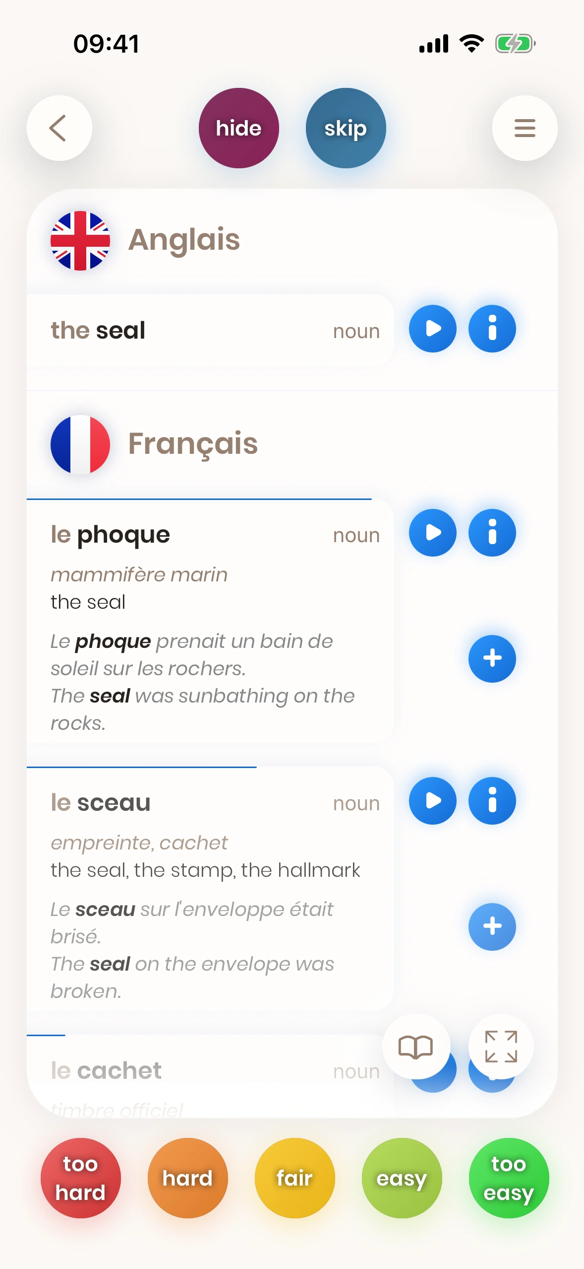 Regardez une carte. Essayez de traduire le mot ou la phrase. Retournez la carte. Dites-nous à quel point c'était difficile. Les mots et phrases difficiles sont montrés à nouveau bientôt.