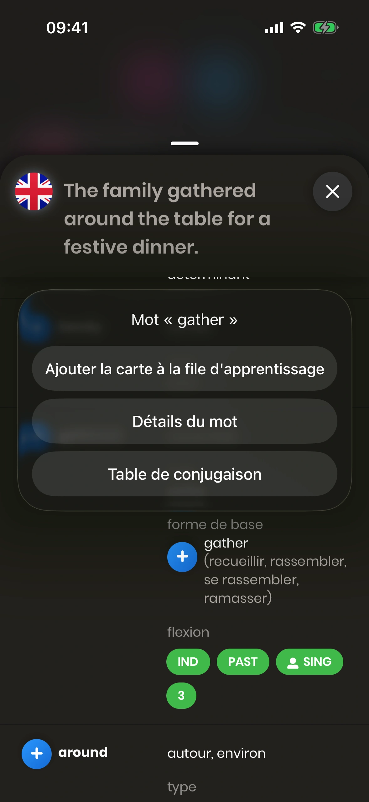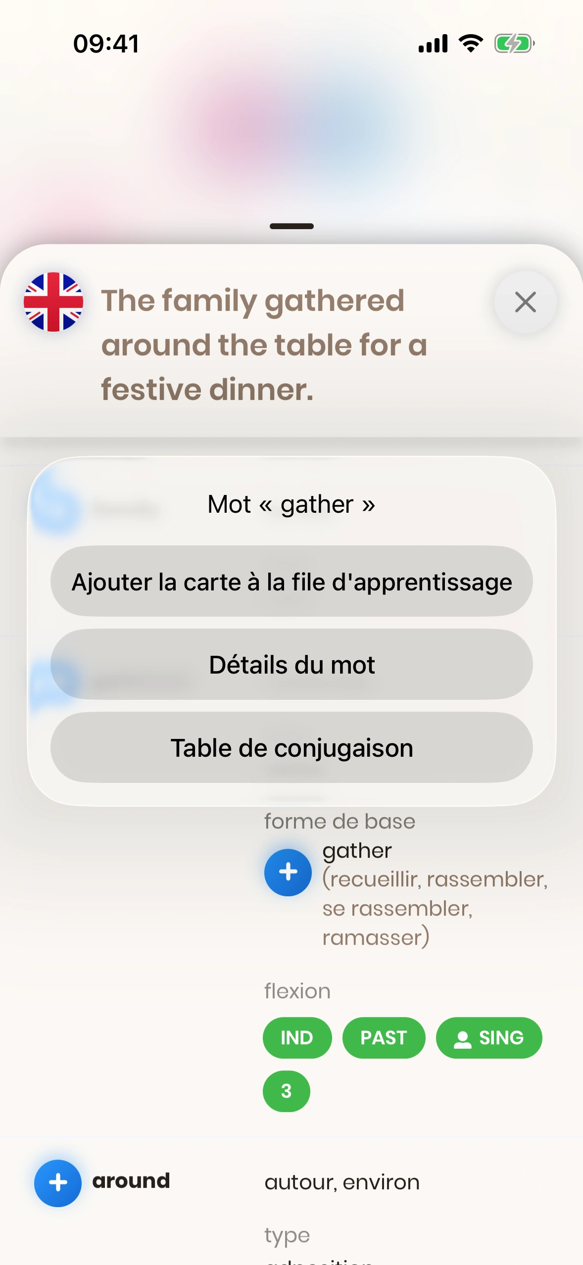 - Ajouter la carte à la file d'apprentissage : Ajoute le mot sélectionné comme carte séparée à ta file d'apprentissage.
