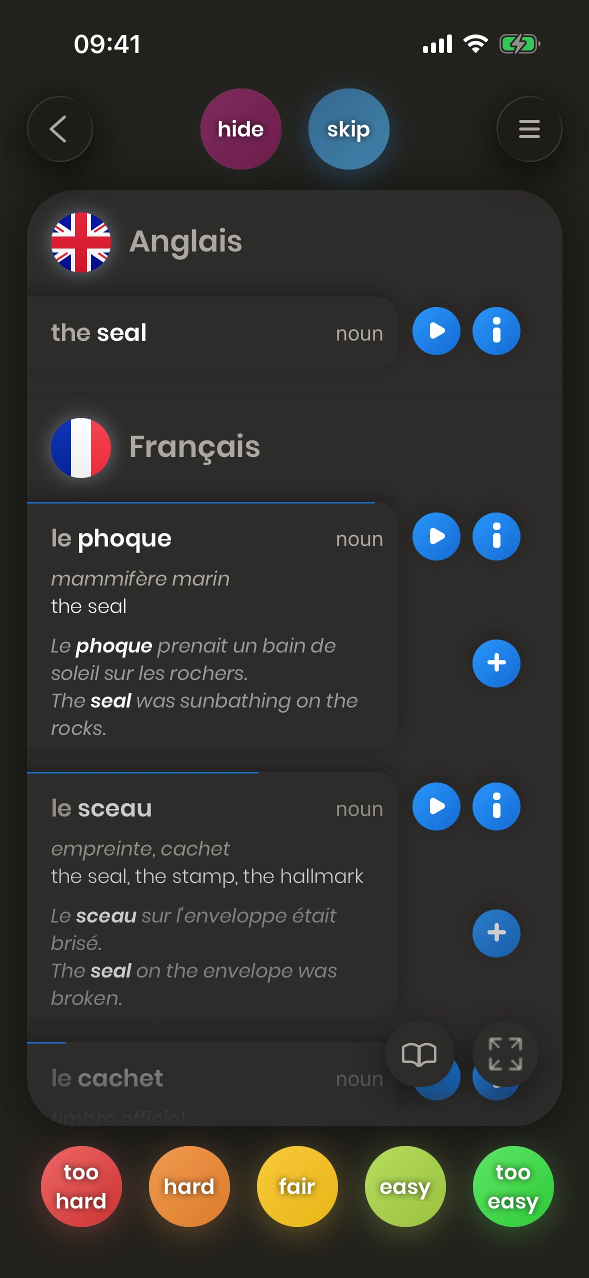 Quand tu pratiques un mot dans différents contextes (comme mot seul et dans des exemples de phrases), tu as de grandes chances de ne plus jamais oublier sa traduction.
