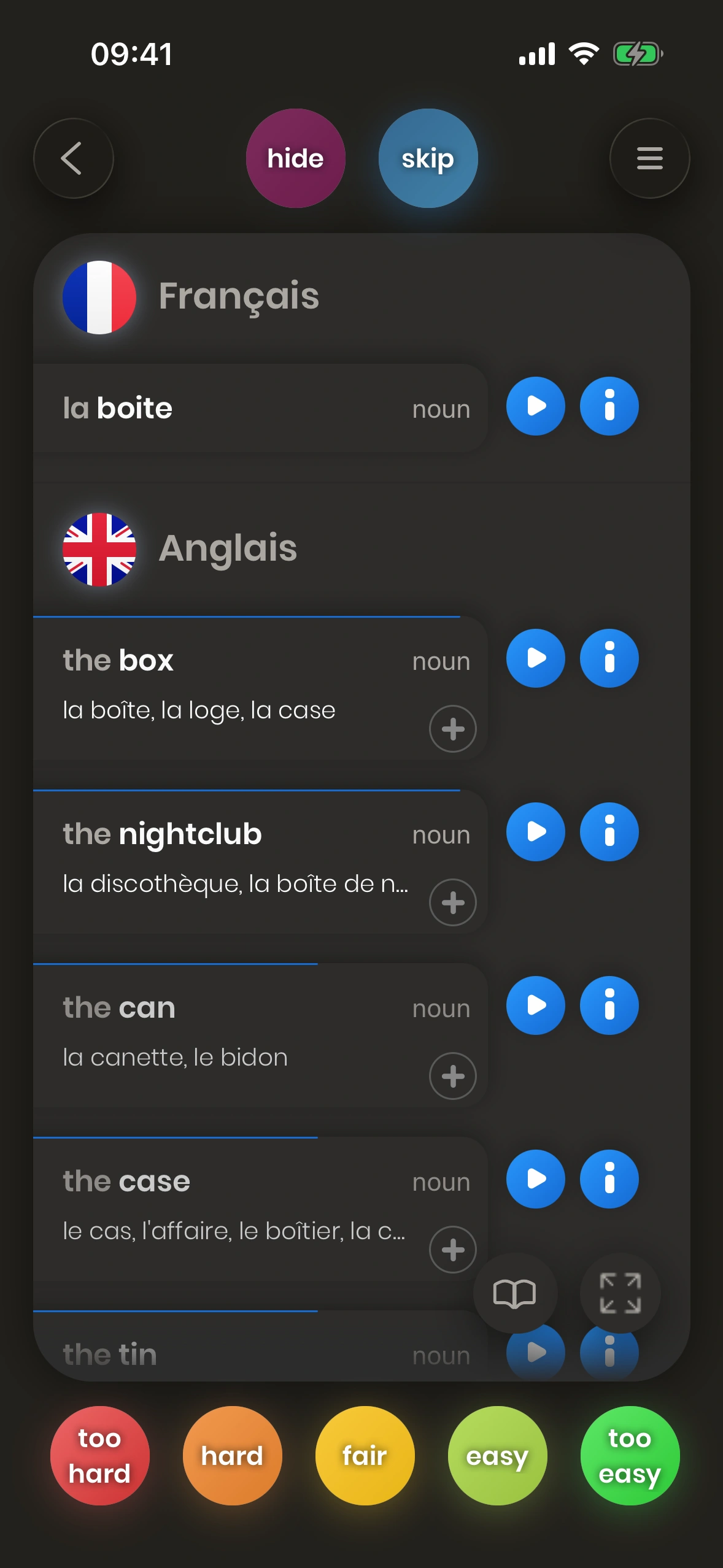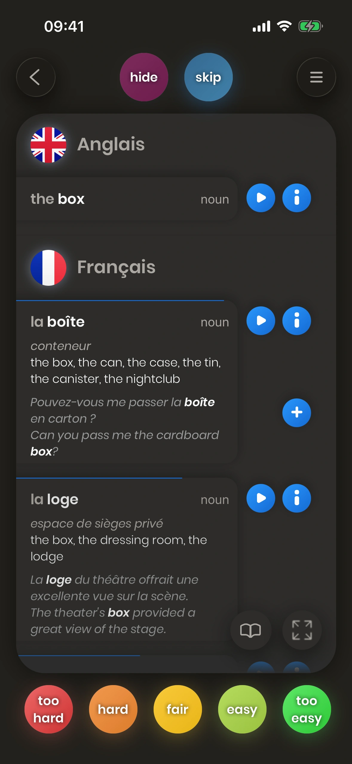 Tu n'as pas besoin de toutes les connaître : si tu peux citer l'une des premières traductions, la carte est considérée comme « apprise ». Plus de détails plus loin.