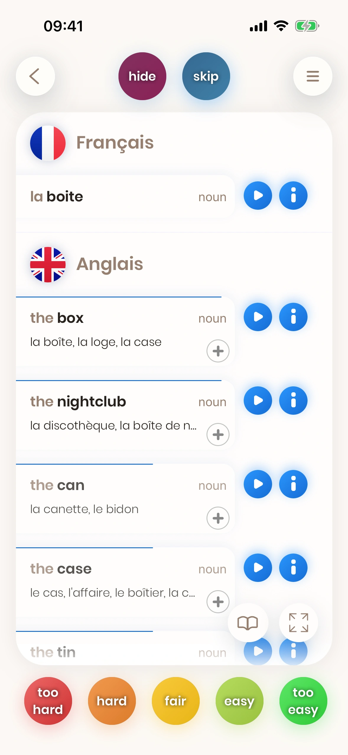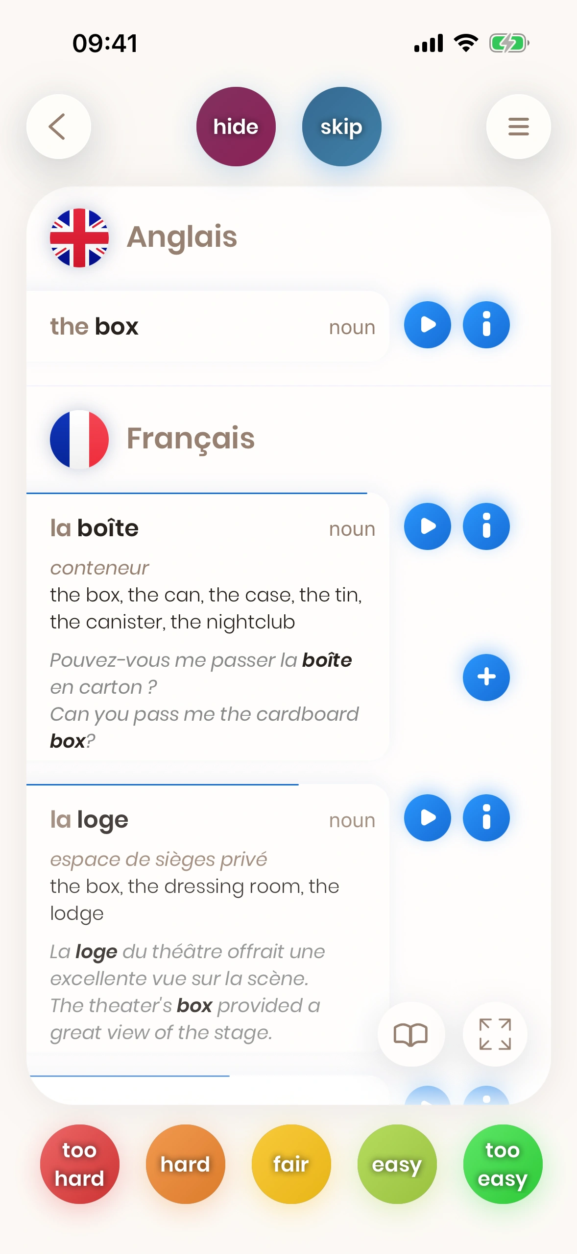 Quand tu parcours un cours de mots, tu reçois des cartes dans les deux sens – tu entraînes ainsi ton vocabulaire actif et passif.