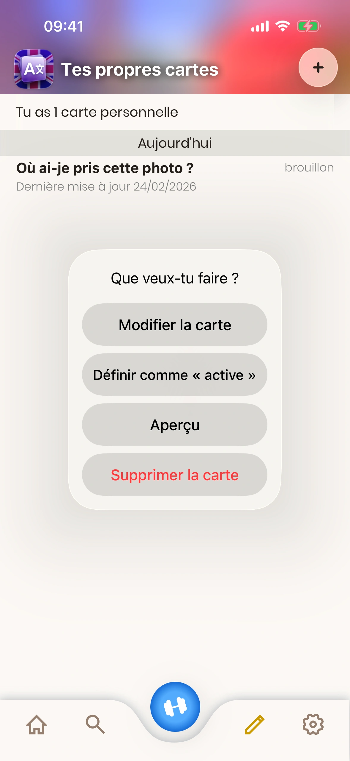 4. Statut de la carte : Une carte personnelle est soit en mode « brouillon » soit « active ». Les cartes en brouillon ne sont pas affichées lors de l'apprentissage. Pour changer le statut d'une carte, appuie dessus.