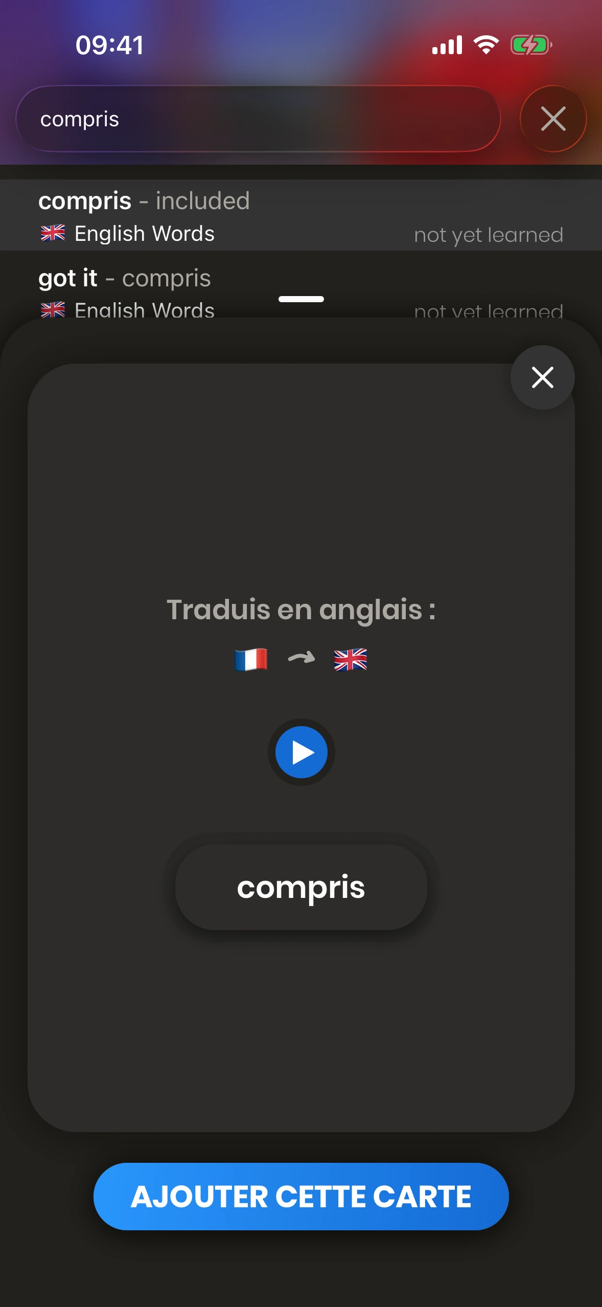 Si tu ne sais pas comment traduire un mot spécifique, tu peux le chercher dans le dictionnaire, puis ajouter cette carte en appuyant sur le bouton AJOUTER CETTE CARTE.