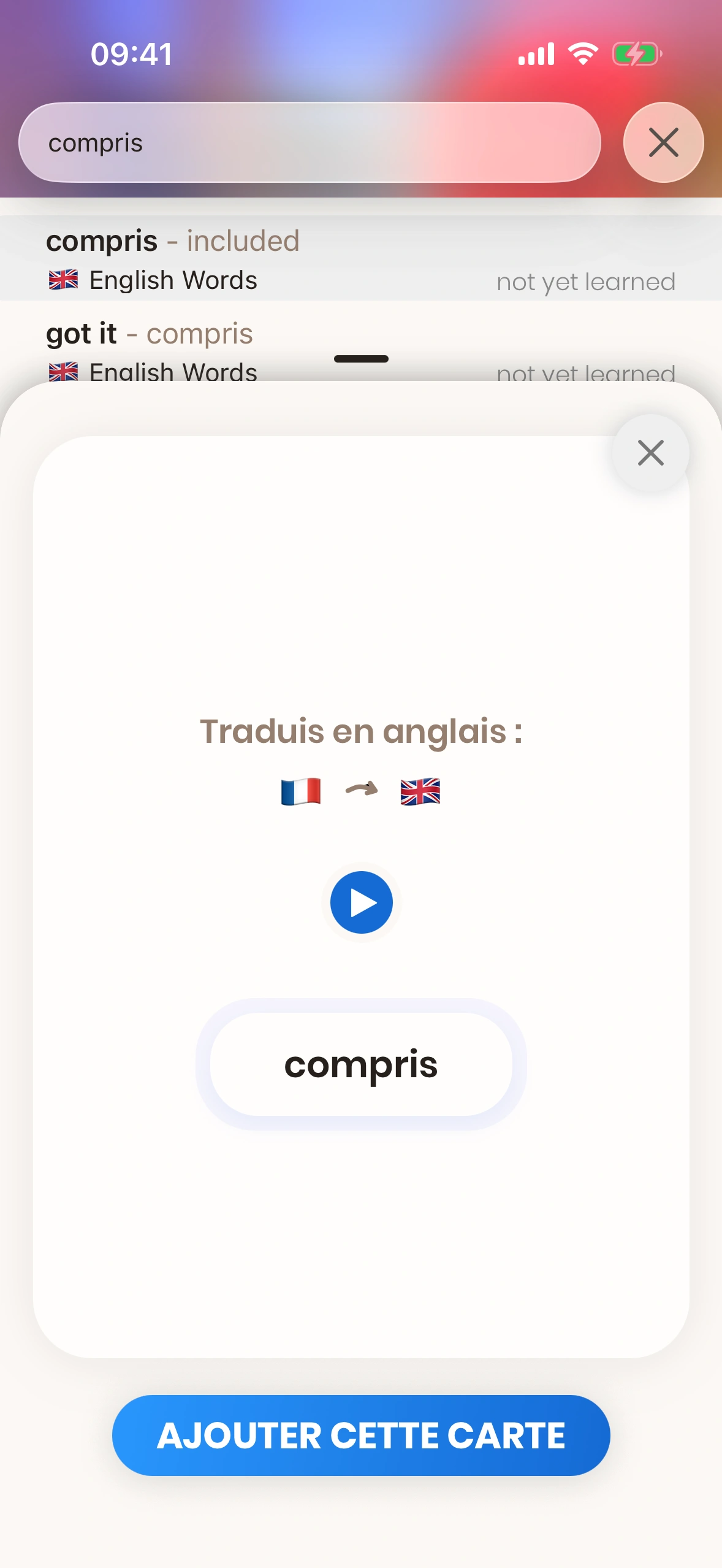 - Le premier résultat est la carte de mot du mot que tu as recherché.