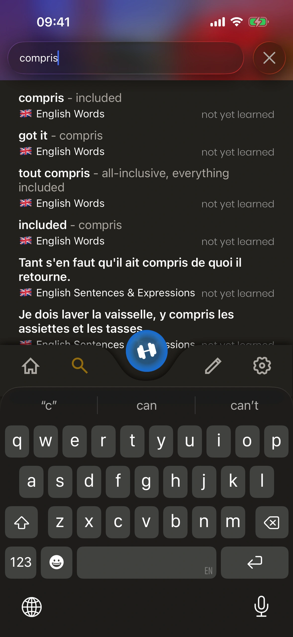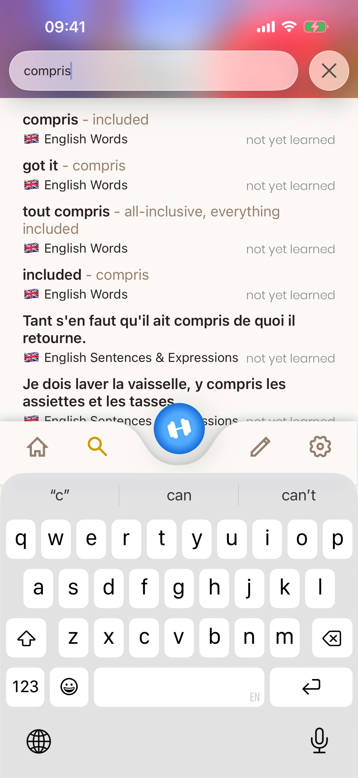 Just English offre un dictionnaire complet, où chaque entrée de dictionnaire est une carte que tu peux ajouter à ta file d'apprentissage !