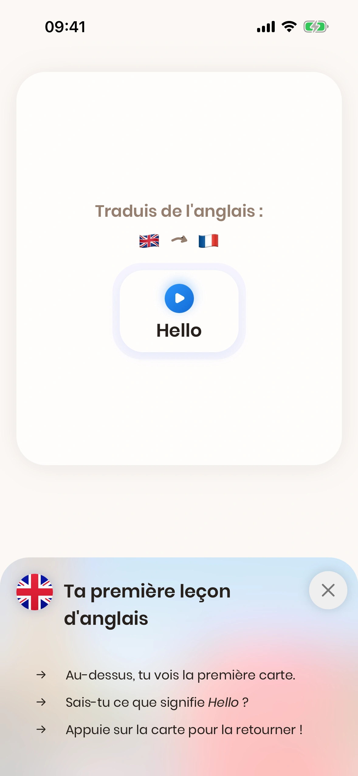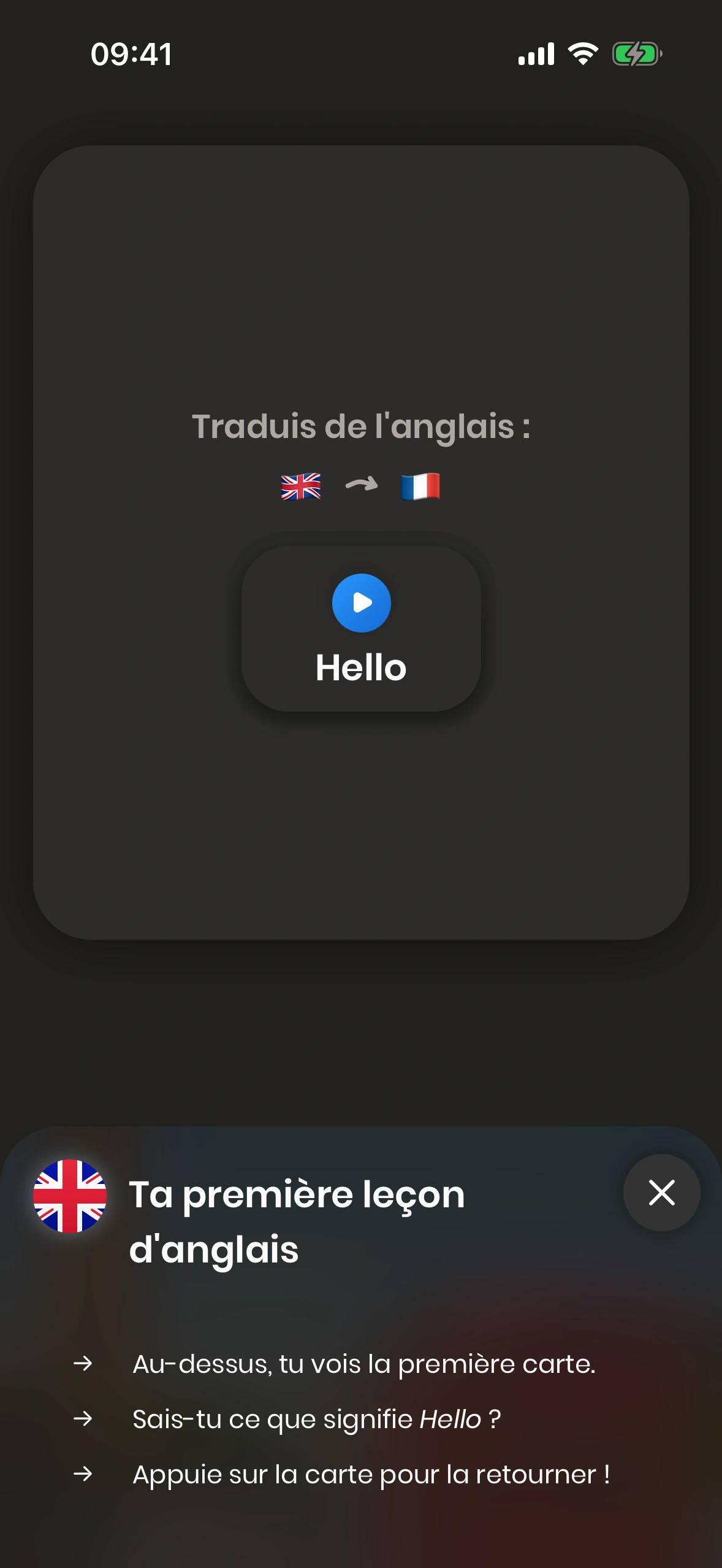 Quand tu lances Just English pour la première fois, tu es guidé(e) à travers le tutoriel.