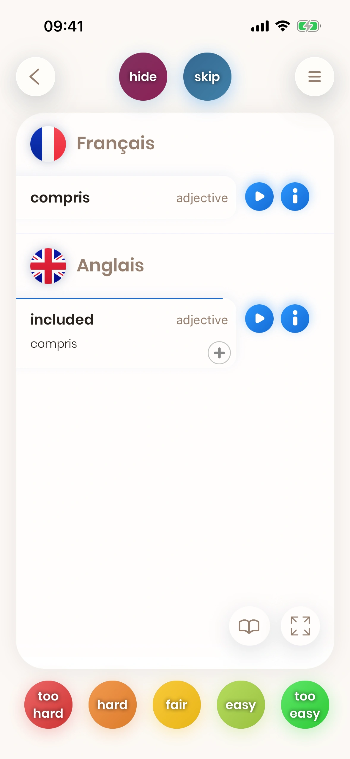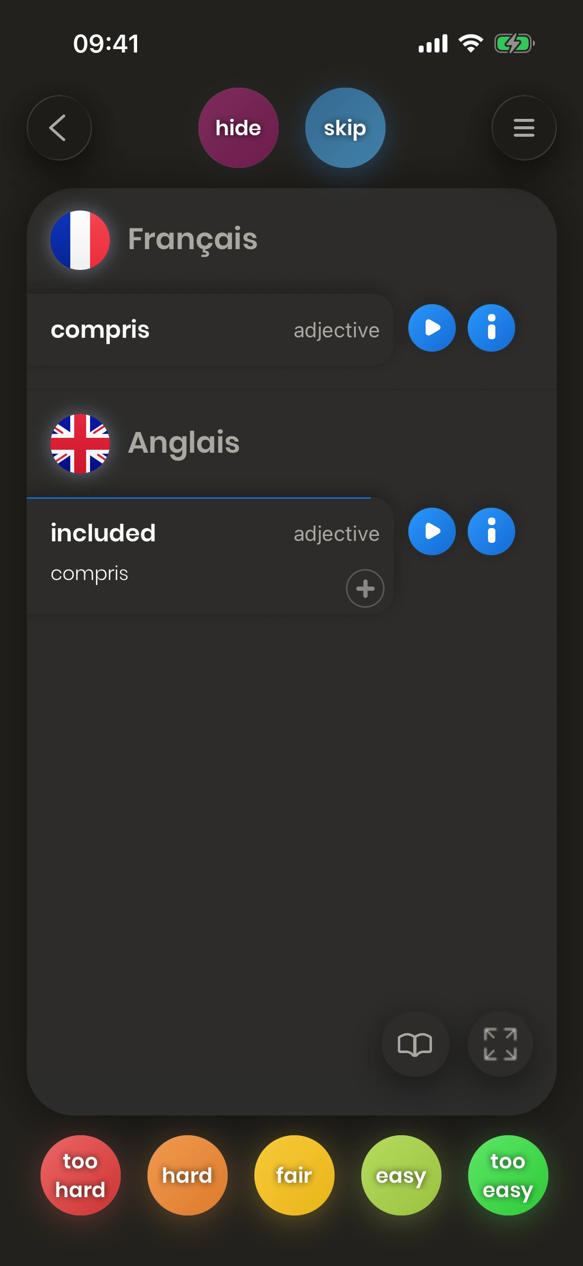 Si la traduction d'un mot ou d'une phrase est difficile pour toi, tu dois l'entraîner plus souvent. C'est pourquoi la carte sera bientôt montrée à nouveau quand tu appuies sur un bouton rouge comme too hard, afin que tu puisses pratiquer ce mot ou cette phrase plus souvent.