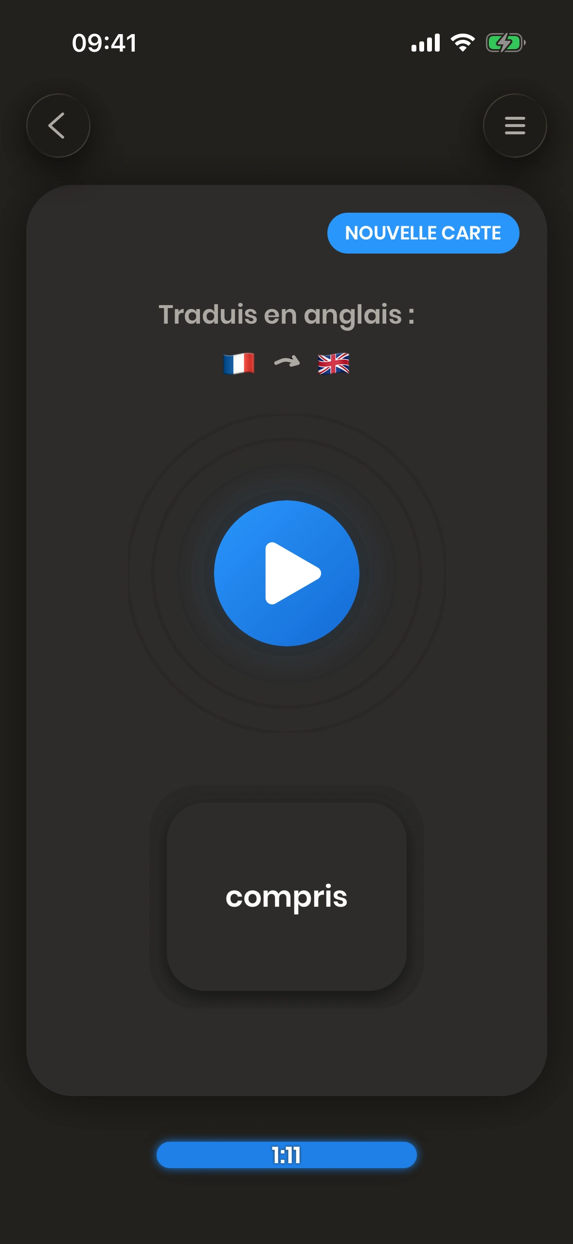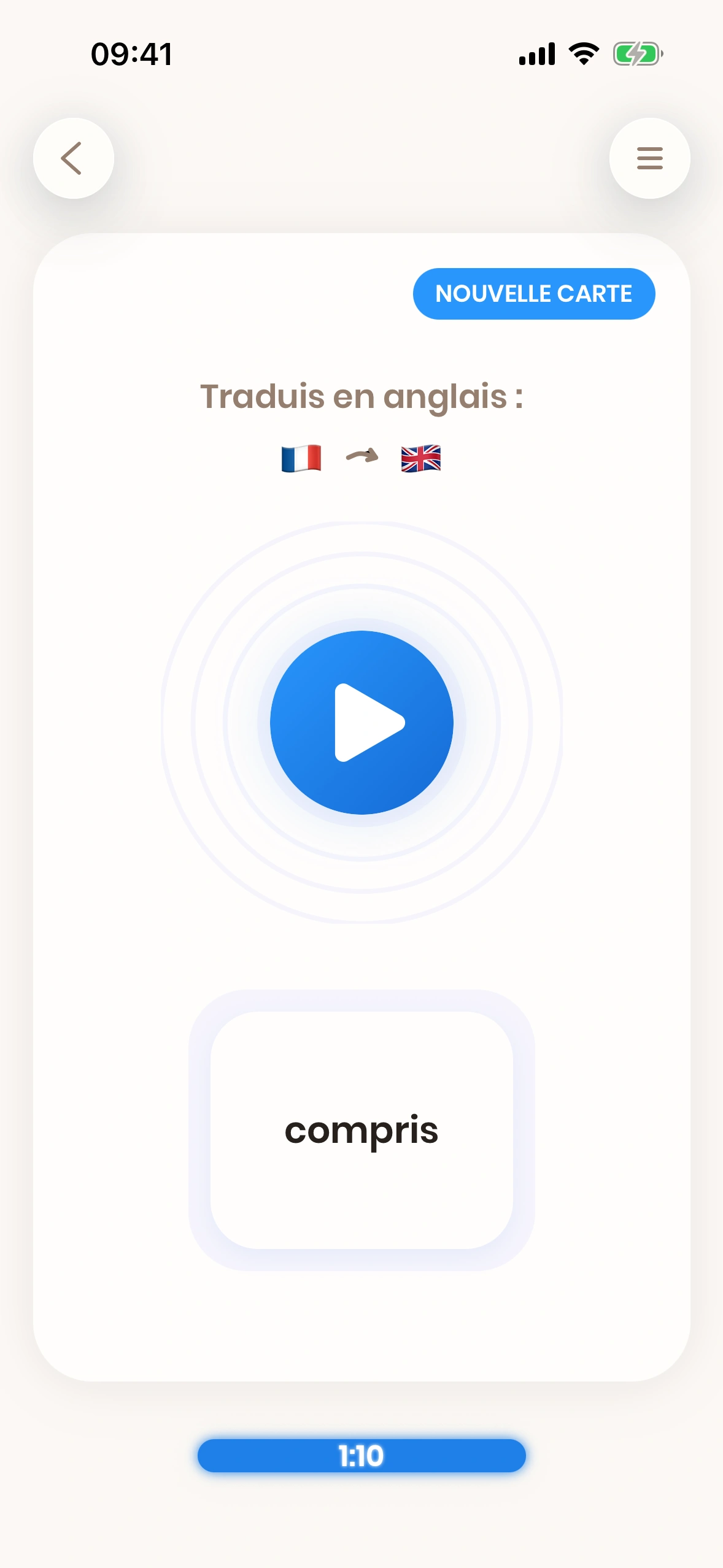 Une fois que tu as traduit le recto – ou non –, tu retournes la carte pour voir le verso, qui te montre une traduction (ou plusieurs traductions).