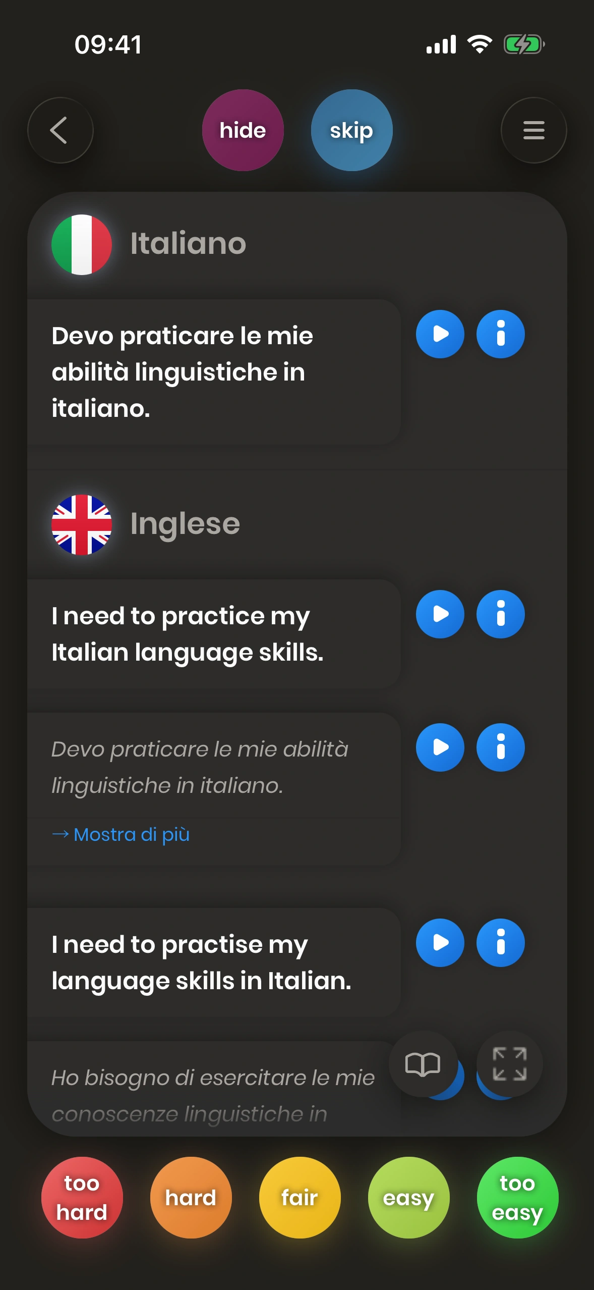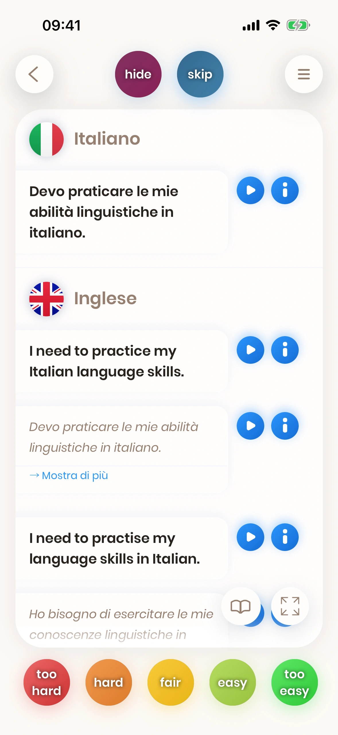 Guarda una carta. Prova a tradurre la parola o la frase. Gira la carta. Dicci quanto era difficile. Le parole e frasi difficili vengono mostrate di nuovo presto.