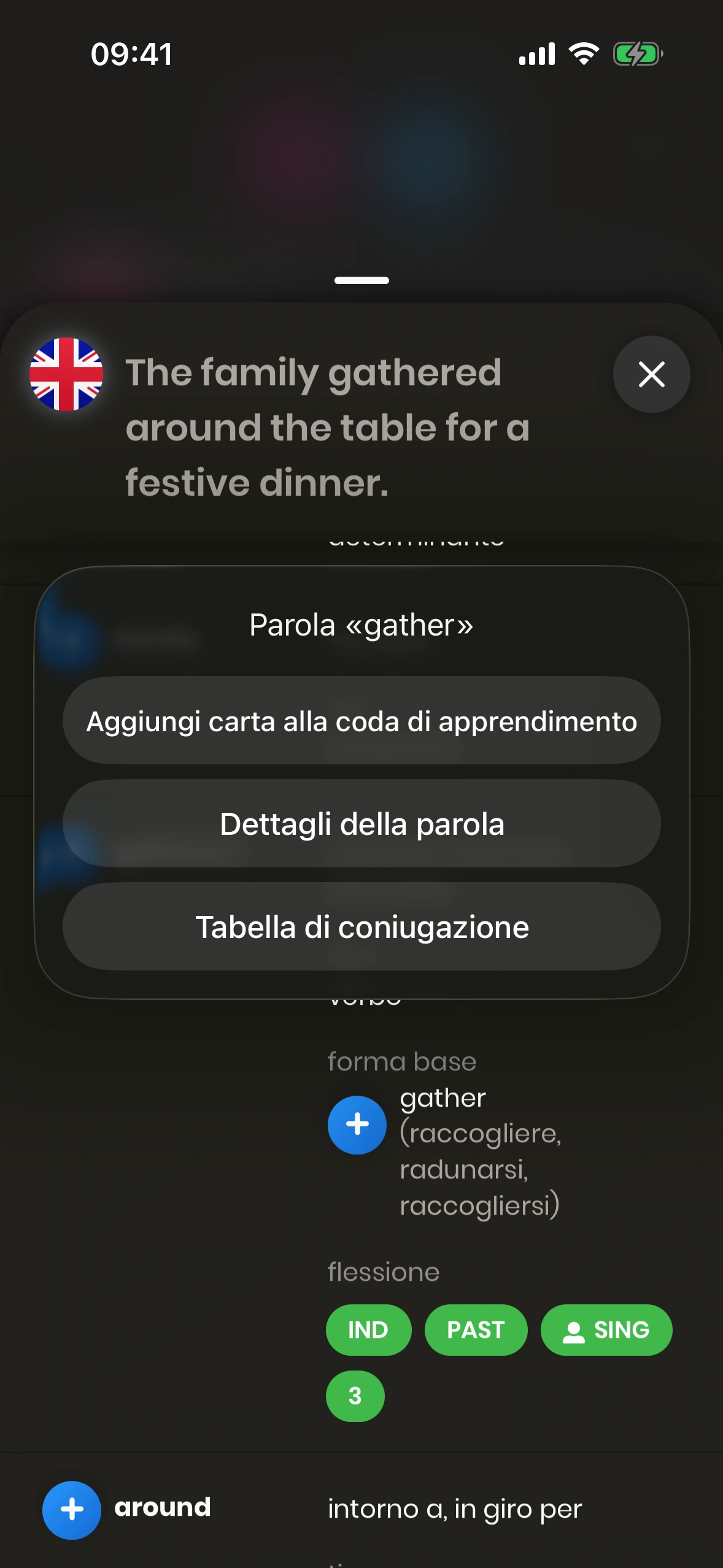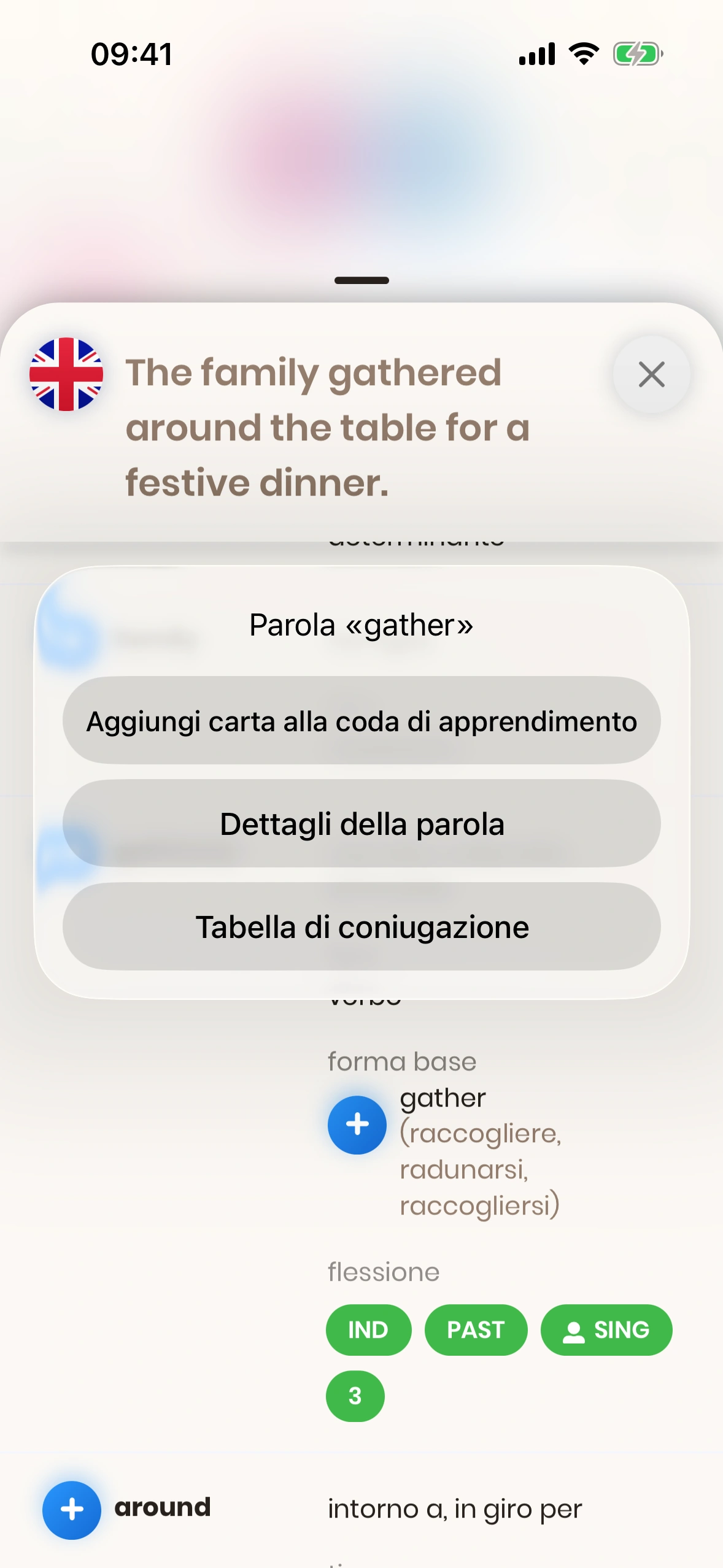 - Aggiungi carta alla coda di apprendimento: Aggiunge la parola selezionata come carta separata alla tua coda di apprendimento.