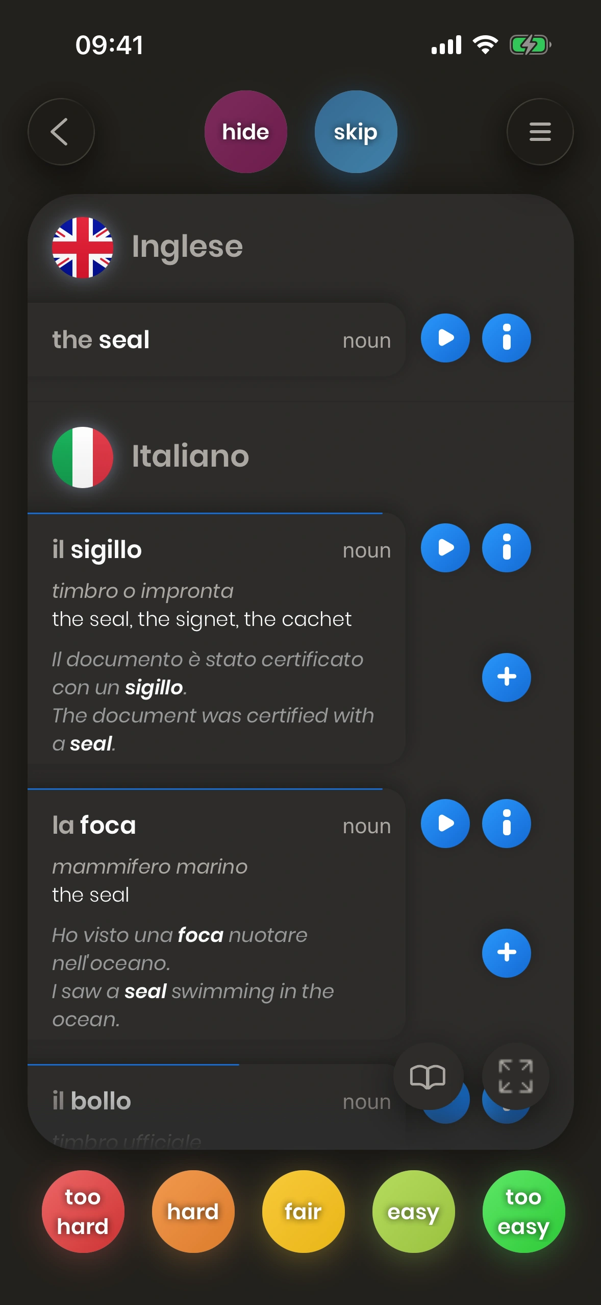 Può essere difficile ricordare distinzioni così sottili, ma con Just English puoi esercitarle nel contesto. Il modo più semplice per non dimenticare mai cosa significa "seal" in inglese è aggiungere quelle frasi di esempio alla tua coda di apprendimento.
