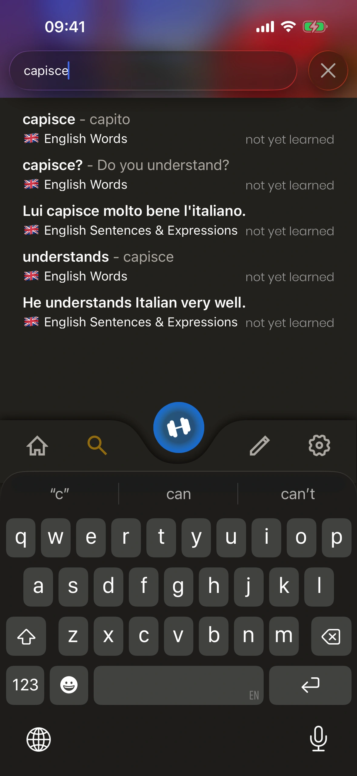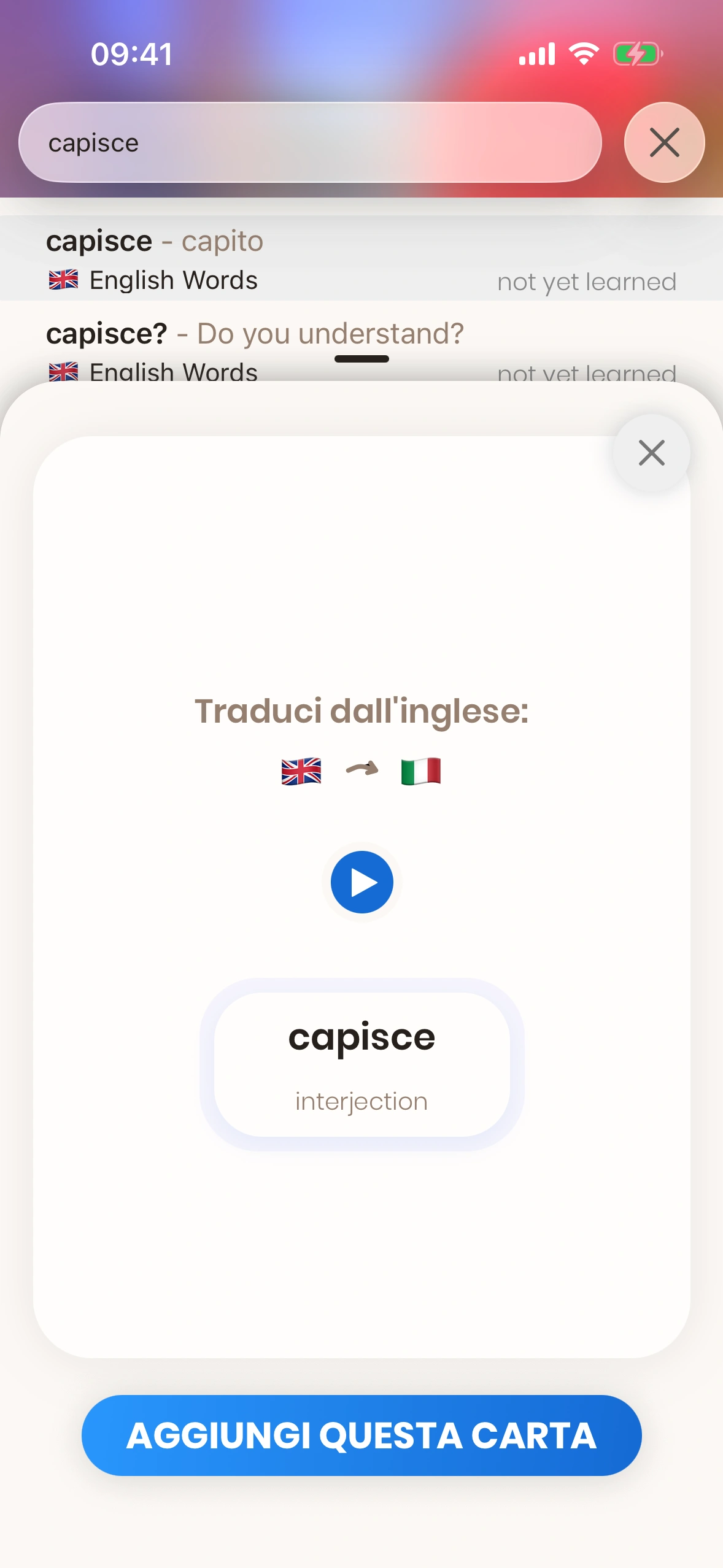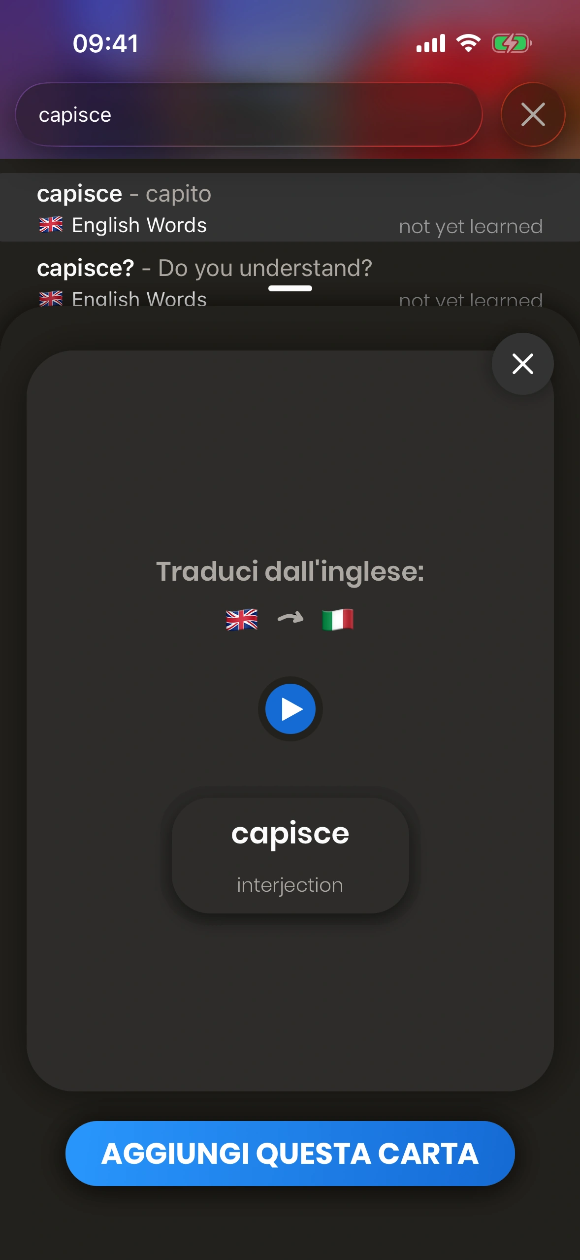 Se non sai come tradurre una parola specifica, puoi cercarla nel dizionario e poi aggiungere questa carta toccando il pulsante AGGIUNGI QUESTA CARTA.