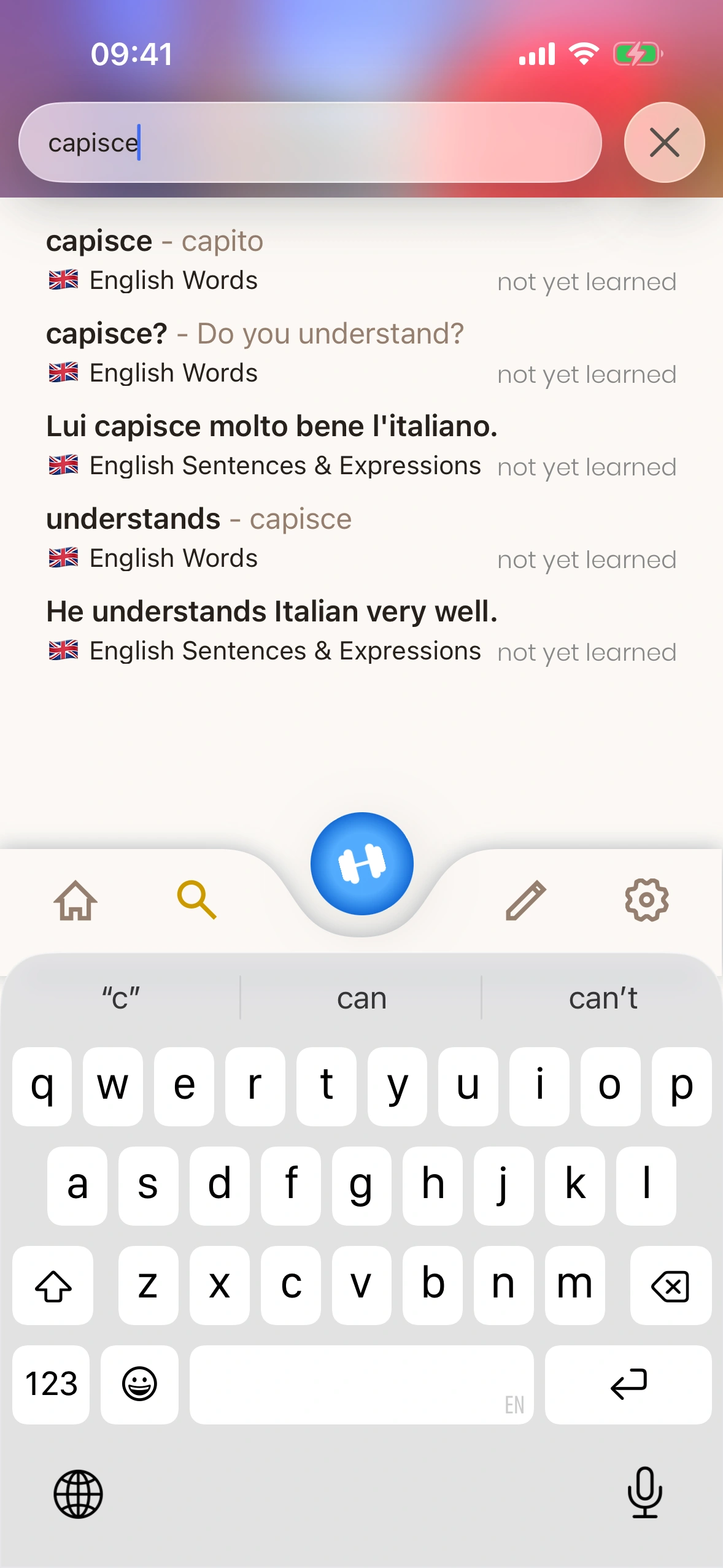 Just English offre un dizionario completo, dove ogni voce del dizionario è una carta che puoi aggiungere alla tua coda di apprendimento!